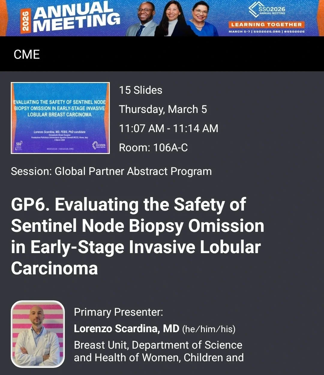 “Delighted to have been invited to the SSO2026 Annual Meeting in Phoenix, where I had the opportunity to present our work on the omission of sentinel lymph node biopsy in early-stage lobular breast cancer.