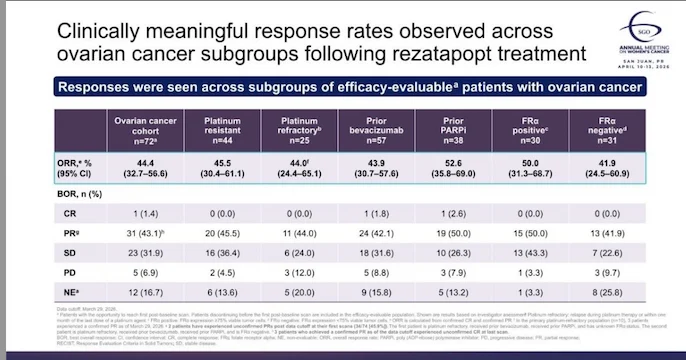 Responses held across prior PARPi, prior bevacizumab, FRα-positive and negative. Heavily pretreated. Didn’t matter.