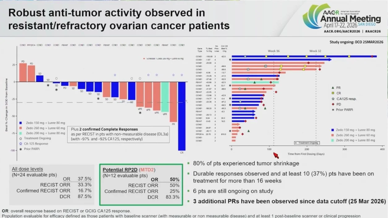 These alterations drive replication stress and have No approved targeted therapy – 24.5% of ovarian, 18.4% of uterine cancers. In resistant/refractory ovarian cancer at the lead dose: