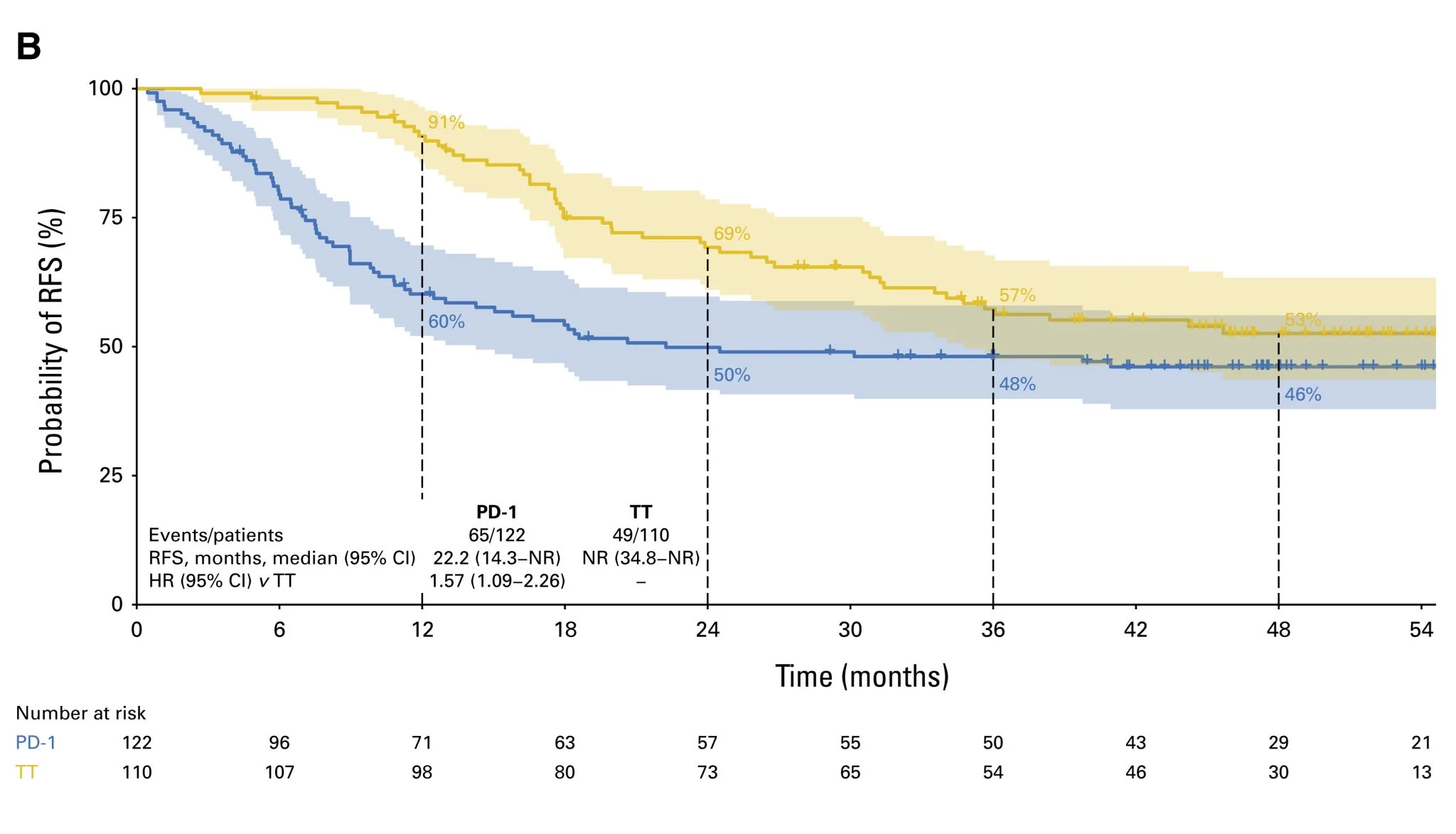 - RFS at ~48 months (crude): PD-1 42.9% vs TT 52.6%; higher recurrence risk with PD-1 vs TT (HR 1.61, 95% CI 1.22–2.11).