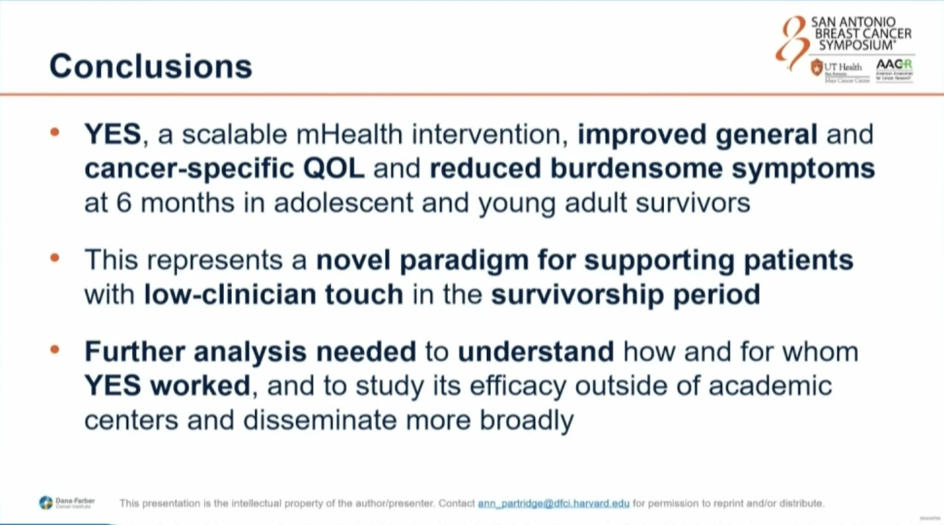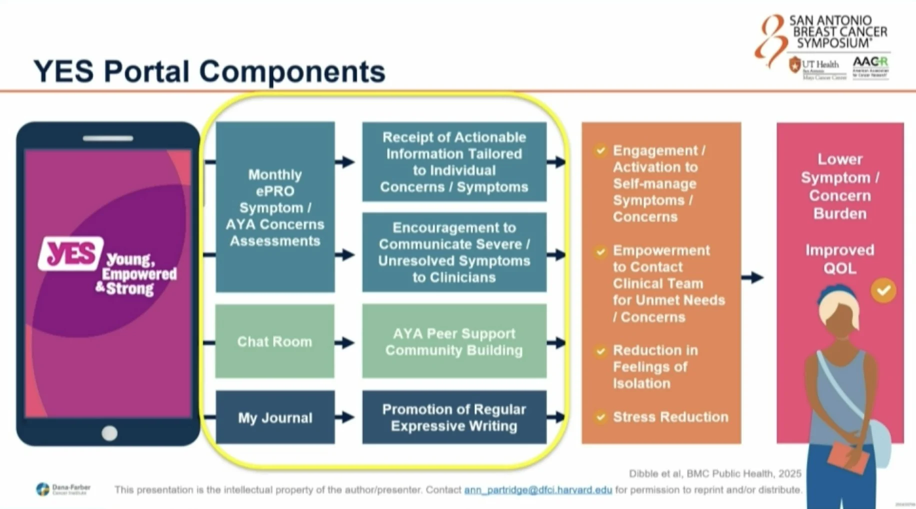“YES: ePRO/chat room/journal tool in AYAs <3 years from end of active treatment for breast cancer, emphasizes self-management and self-monitoring. Improved QoL, no significant change in depression/anxiety. Some symptoms improved.”