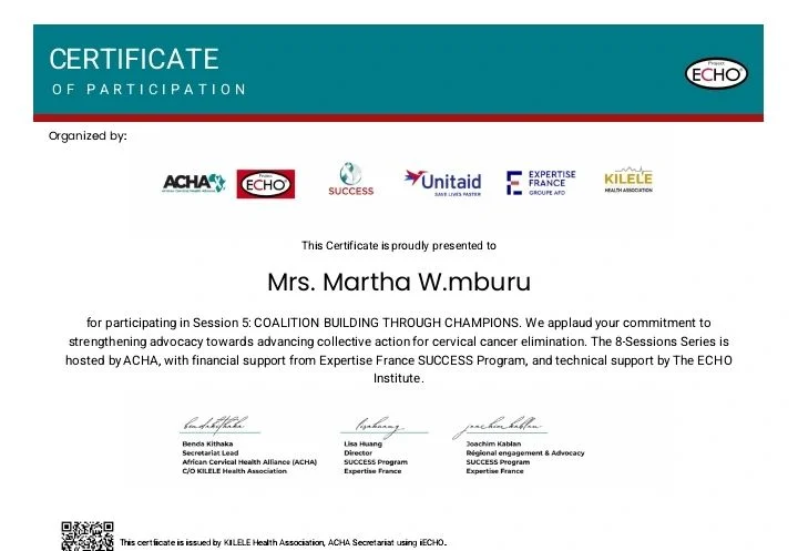 Martha Wanjiru, Nurse educator and ToT in breast and cervical cancer screening and treatment of precancerous lesions screening, cervical advocate and champion Kiambu County, Kenya, shared a post on LinkedIn: