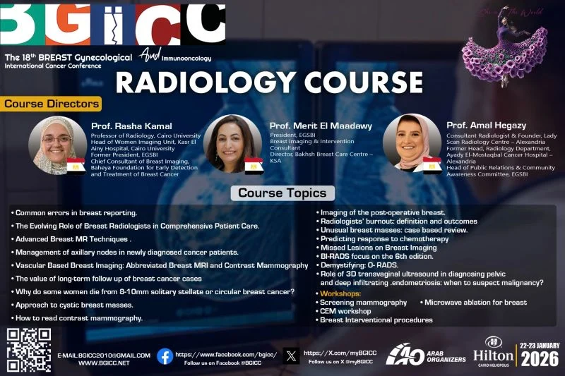 The BGICC, now in its 18th year, has featured this course as a dedicated track for radiologists within one of the largest multidisciplinary international conferences for breast and gynecologic oncology in the region. It is a true privilege to be part of a team led by the genuine and visionary leadership of Prof. Hesham Elghazaly and BGICC incredible team.