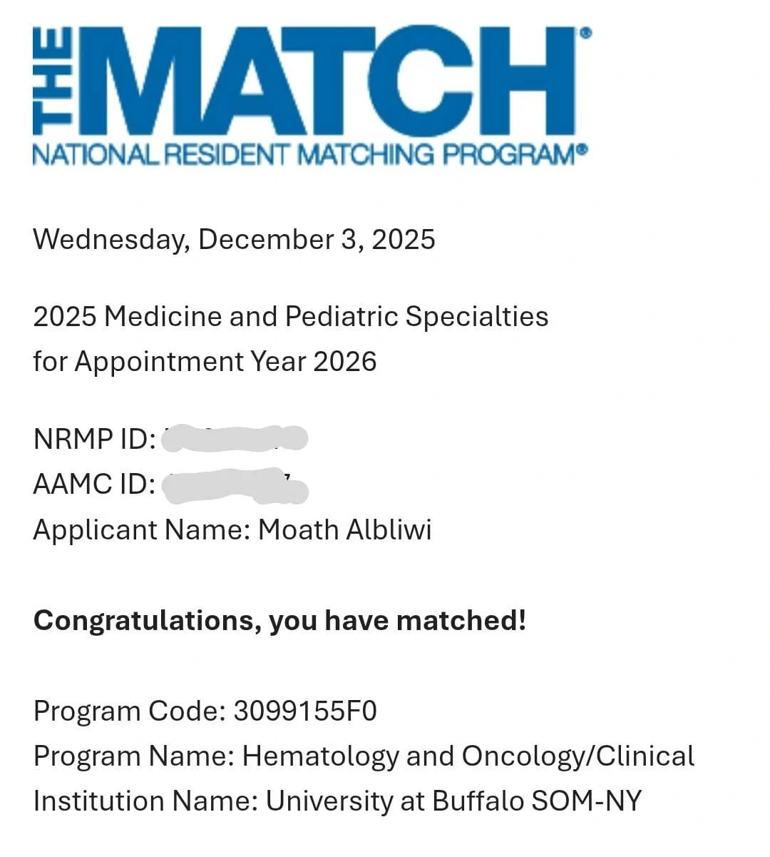 “I am excited and honored to share that I have matched into the Hematology & Oncology Fellowship at the University at Buffalo.