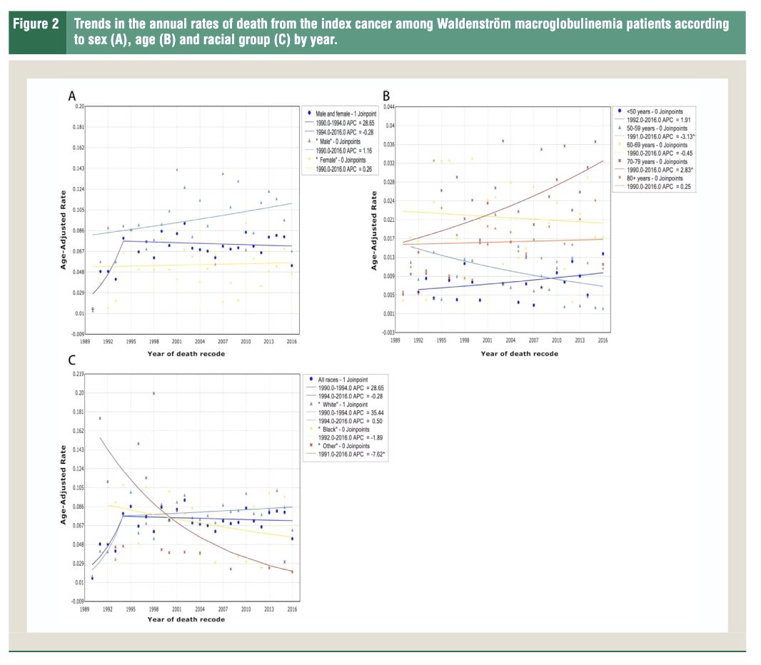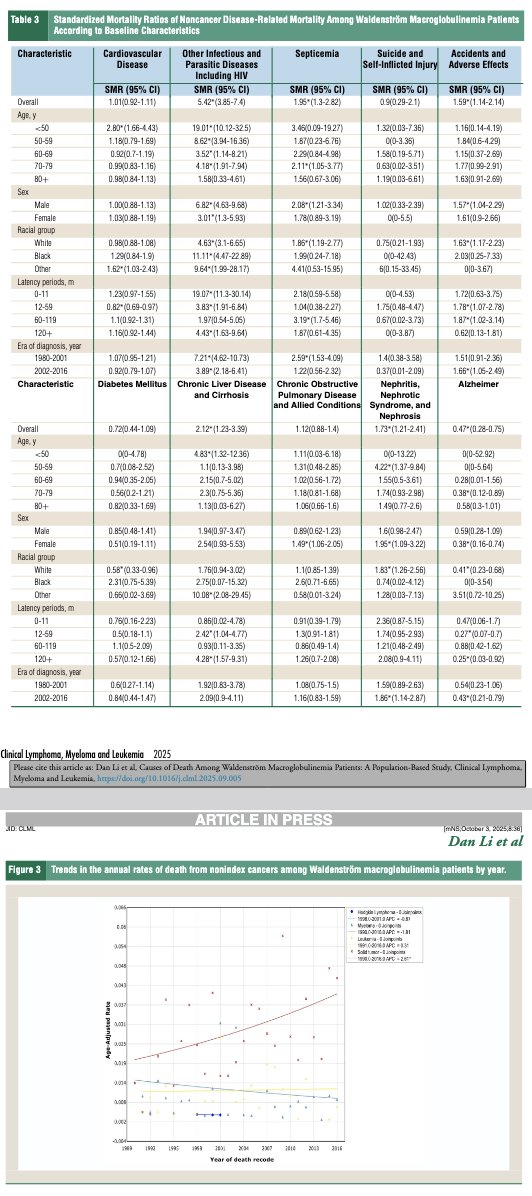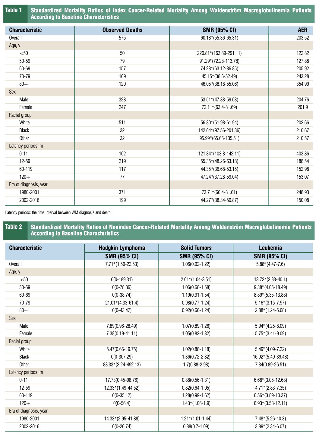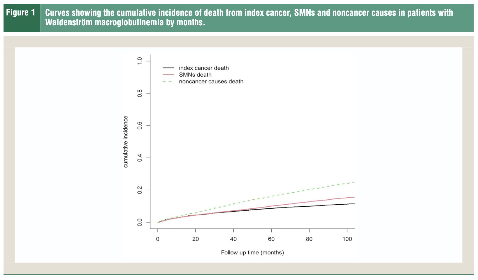 Population-based study of causes of death among Waldenström patients finds highest standardized mortality in 1st year after diagnosis; heme malignancy-related deaths increased; solid neoplasm deaths elevated 10 years after diagnosis.”