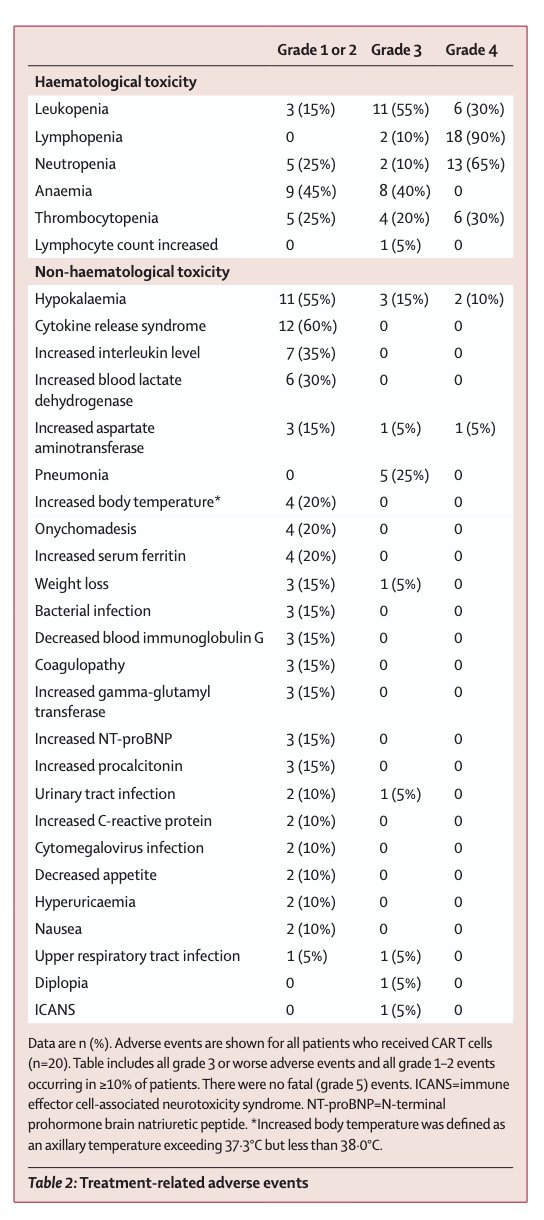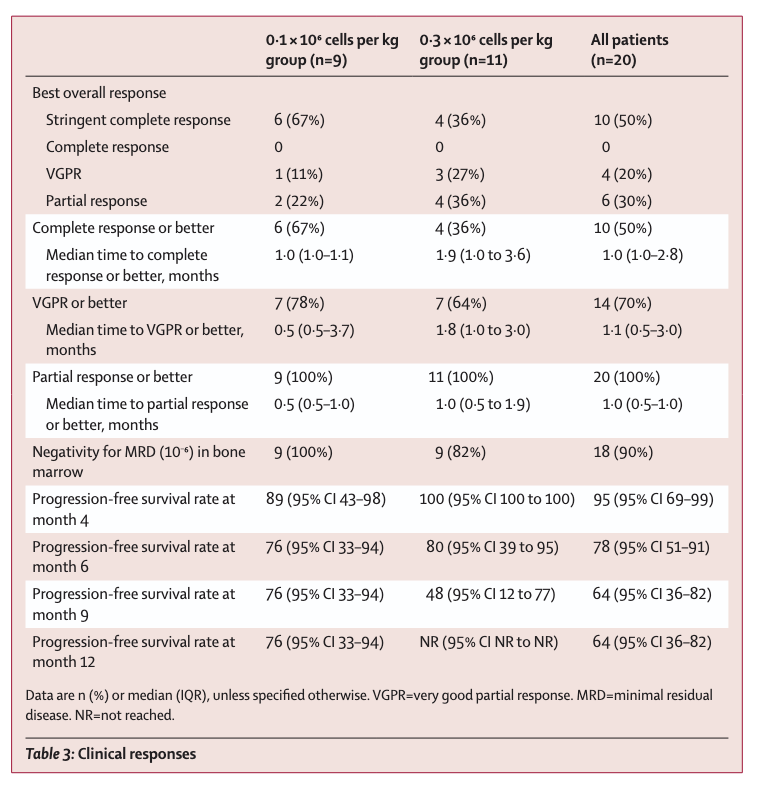 GPRC5D-targeted CAR T (CT071) in relapsed/refractory myeloma finds no DLTs, RP2D 0.1×106 cells/kg, heme toxicities most common G3 or worse TEAEs, CRS in 12 (60%), all of G1-2, 1 (5%) G3 ICANS, ORR 100%, CR or better 50%.”