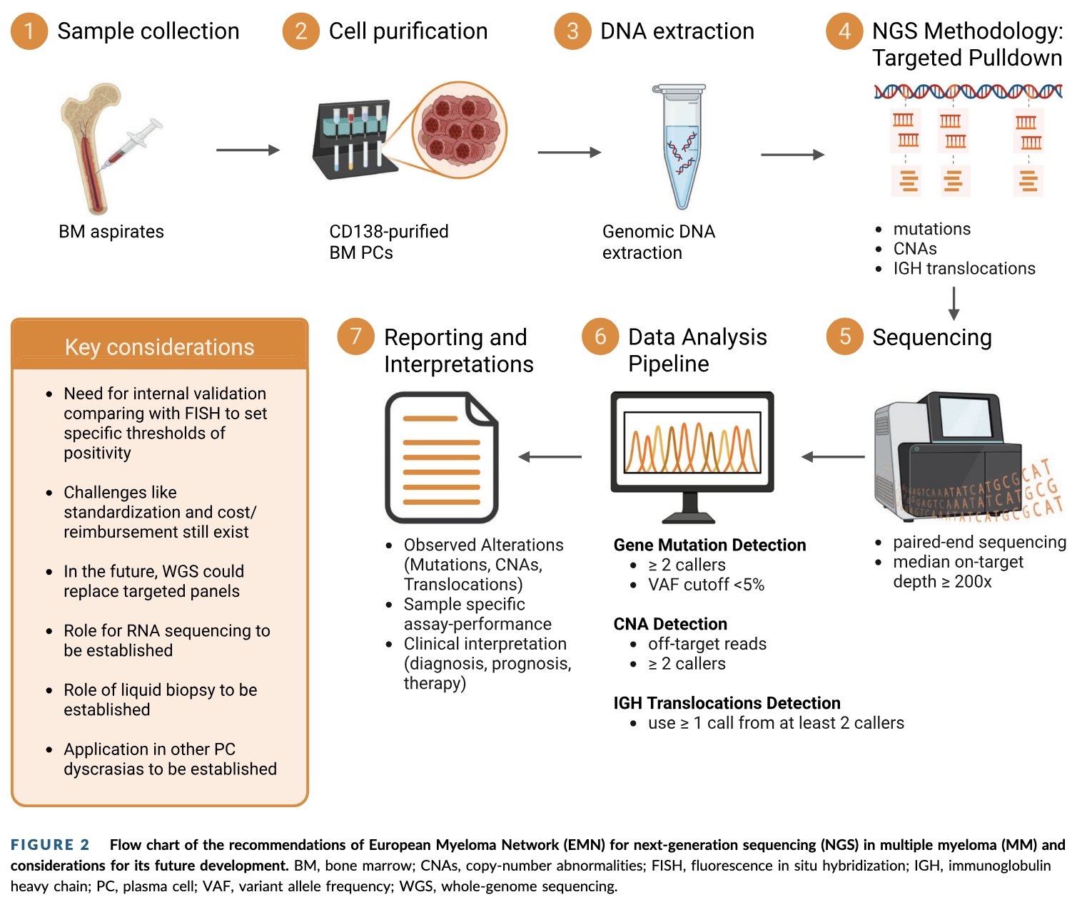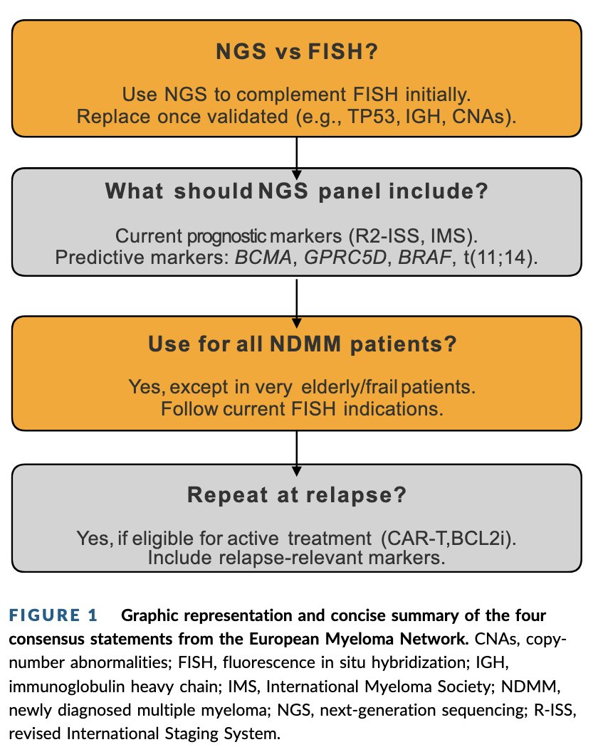 European Myeloma Network Consensus on next-gen sequencing for prognostic stratification of NDMM suggests broader list of events be incorporated, test should be offered at least to fit patients, and should be repeated at relapse.”