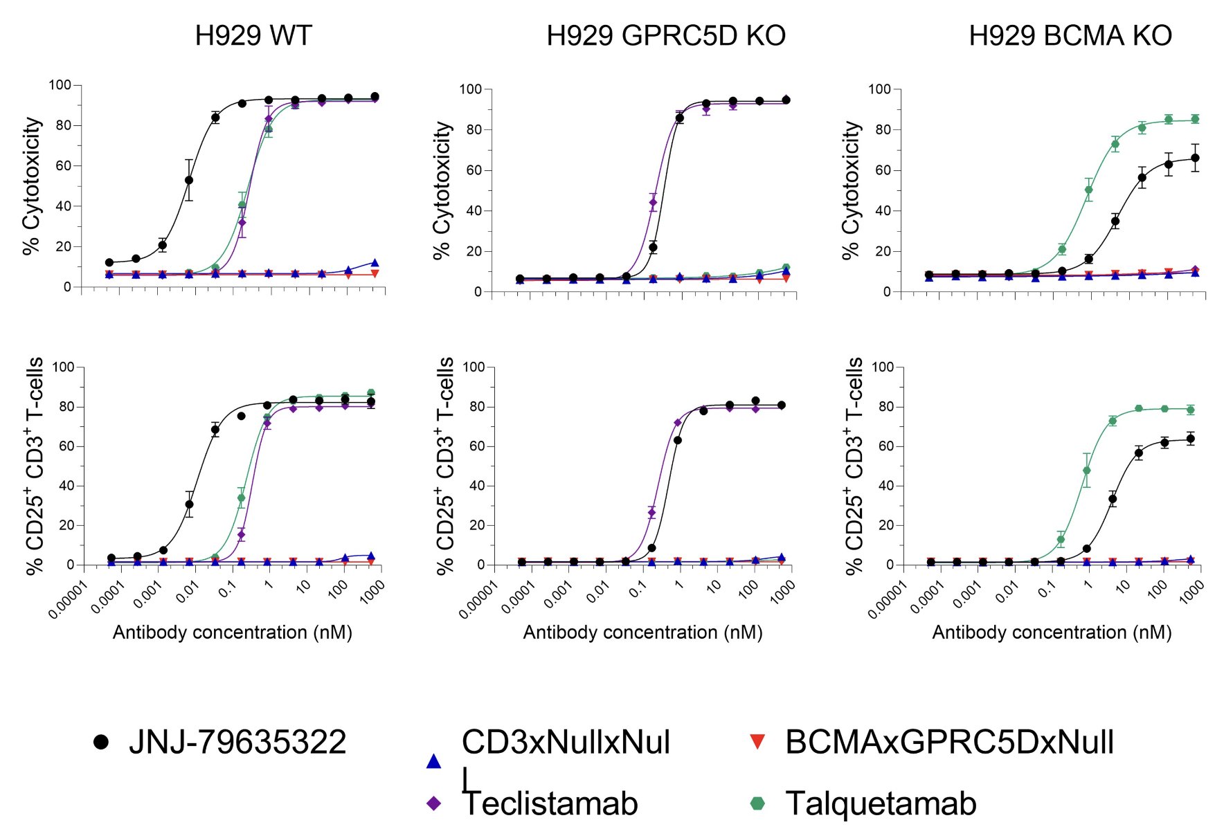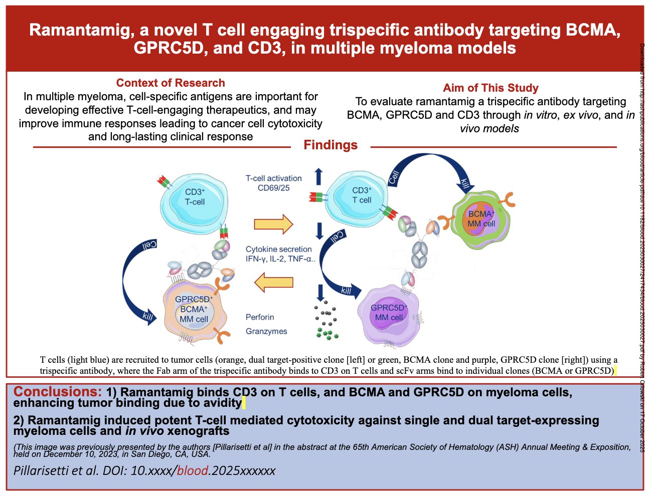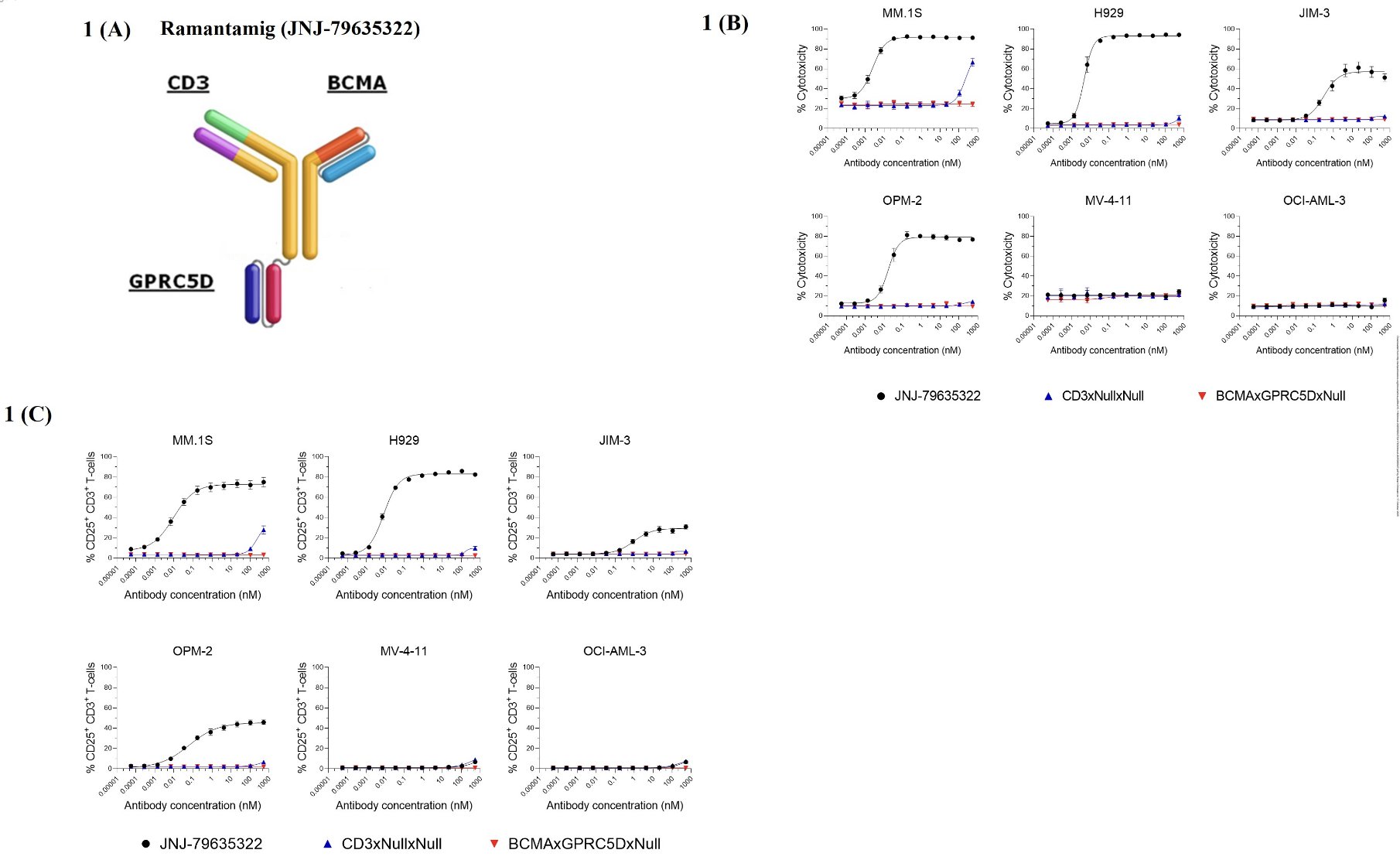 Ramantamig (JNJ-79635322), a novel TCE trispecific mAb targeting BCMA, GPRC5D, and CD3, shows potent cytotoxicity in cancer cell lines with T-cell activation + in a murine xenograft prevention model; Phase I studies ongoing.”