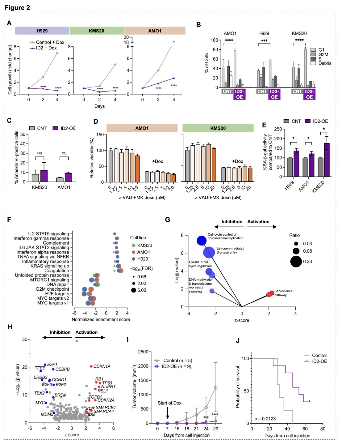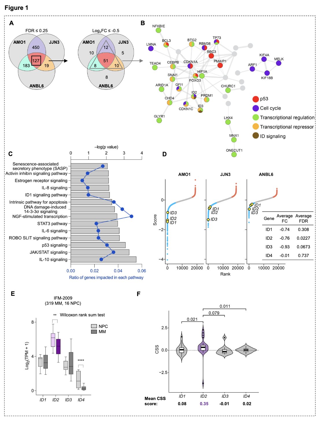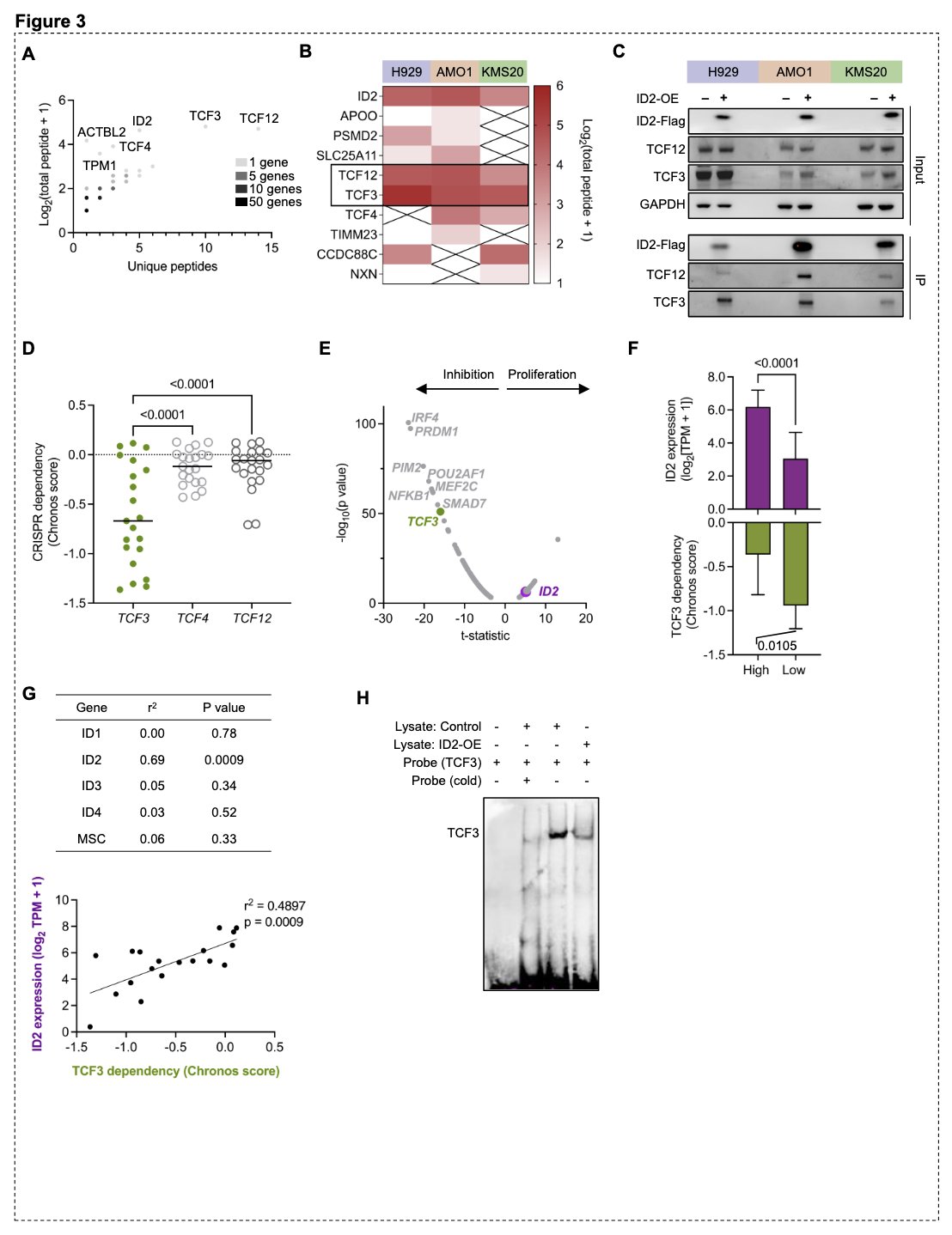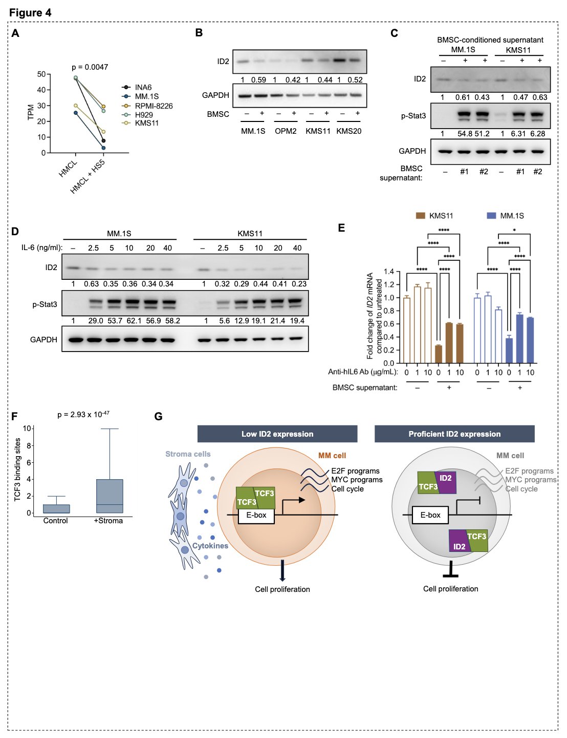 ID2 suppresses multiple myeloma cell proliferation by repressing the activity of the transcription factor TCF3; BM milieu supports this by further decreasing ID2 expression and enhancing TCF3 activity, partly via IL-6.”