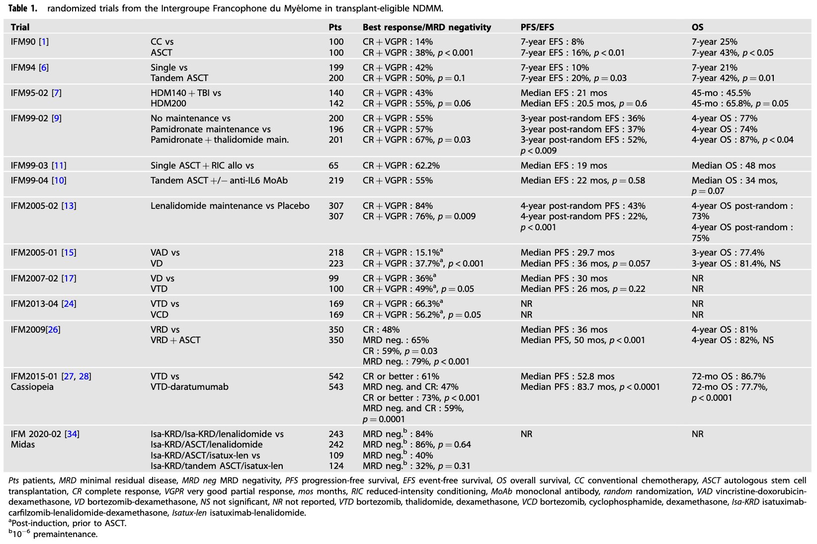 Important overview of 35 years of academic trials focusing on high-dose therapy and autologous stem cell transplantation from the Intergroupe Francophone du Myélome (IFM) experience.”