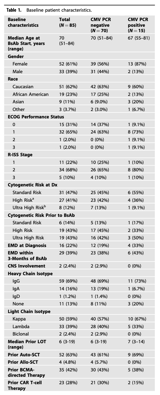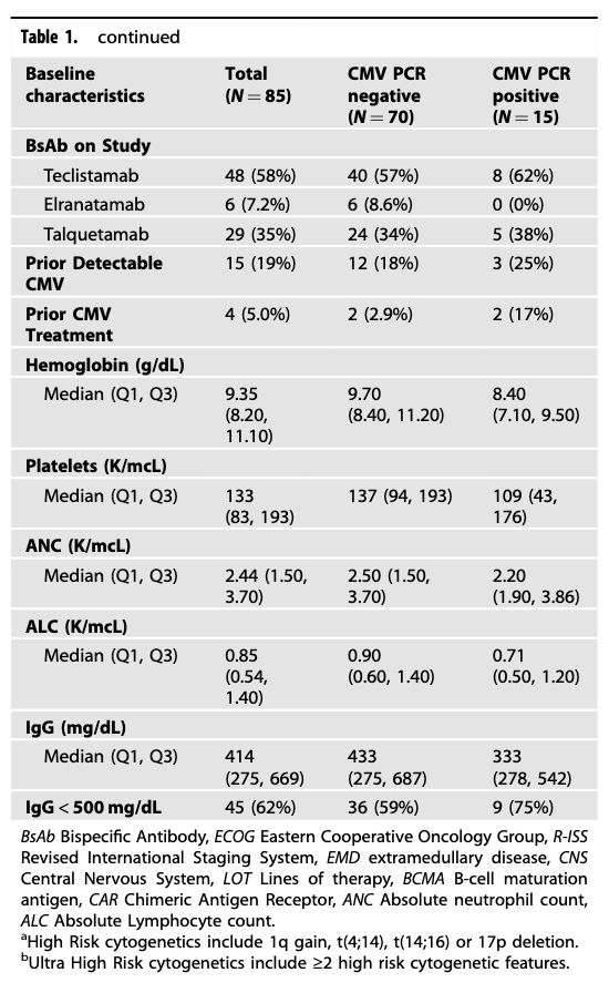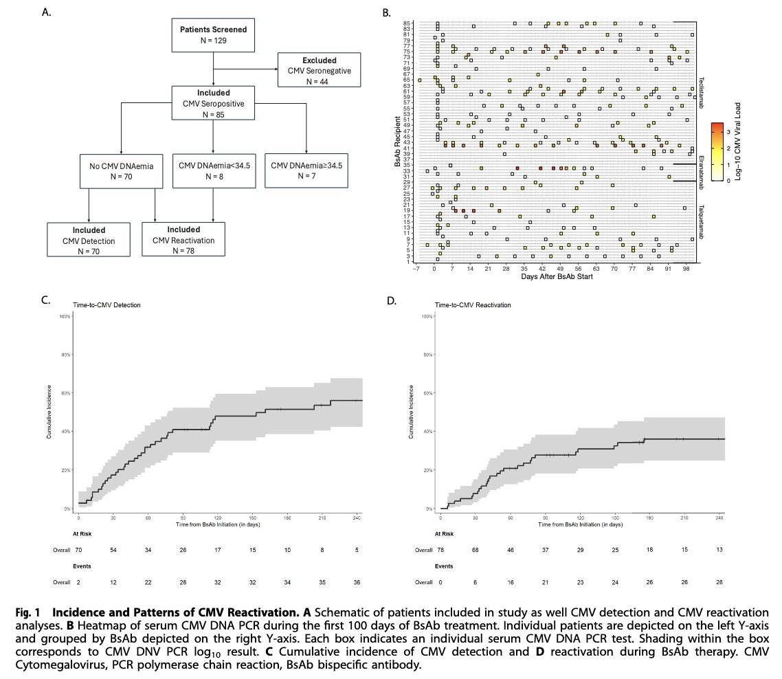 CMV reactivation during bispecific tx for relapsed/refractory myeloma shows cumulative reactivation of 28% at Day 90, 36% at Day 180; baseline characteristics not associated with increased risk, but were associated with worse OS.”