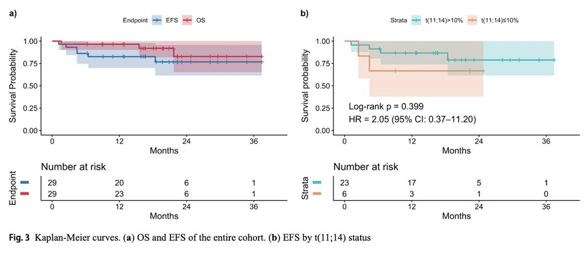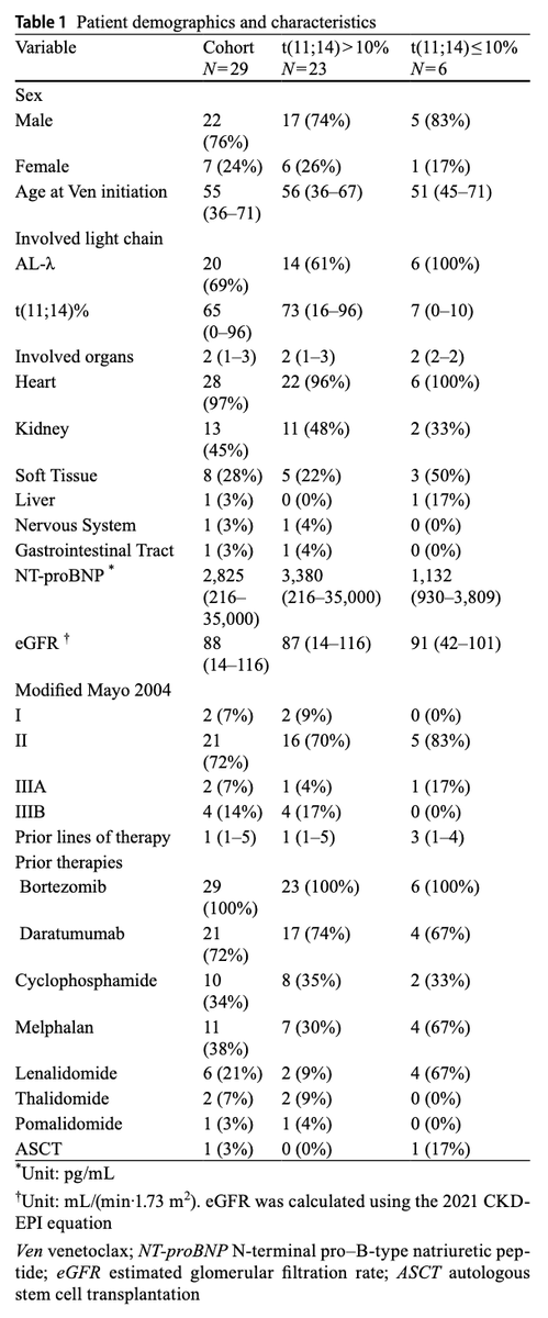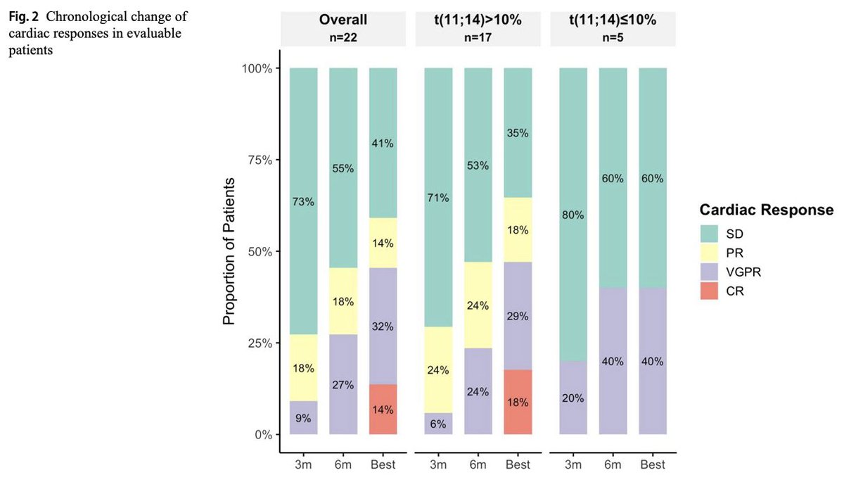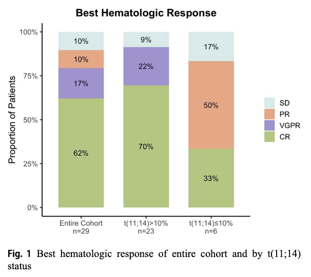 Venetoclax shows 79% VGPR or CR in relapsed/refractory AL amyloidosis; high t(11;14)(>10%) pts achieved ≥ VGPR in 91% vs 33% in low t(11;14); cardiac responses in 59% of evaluable patients; 1-yr OS and EFS of 96.6% and 82.6%.”