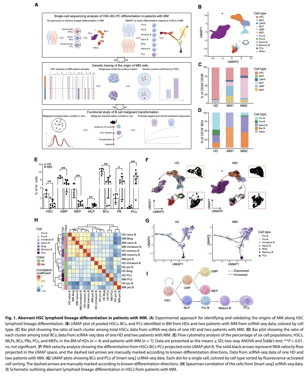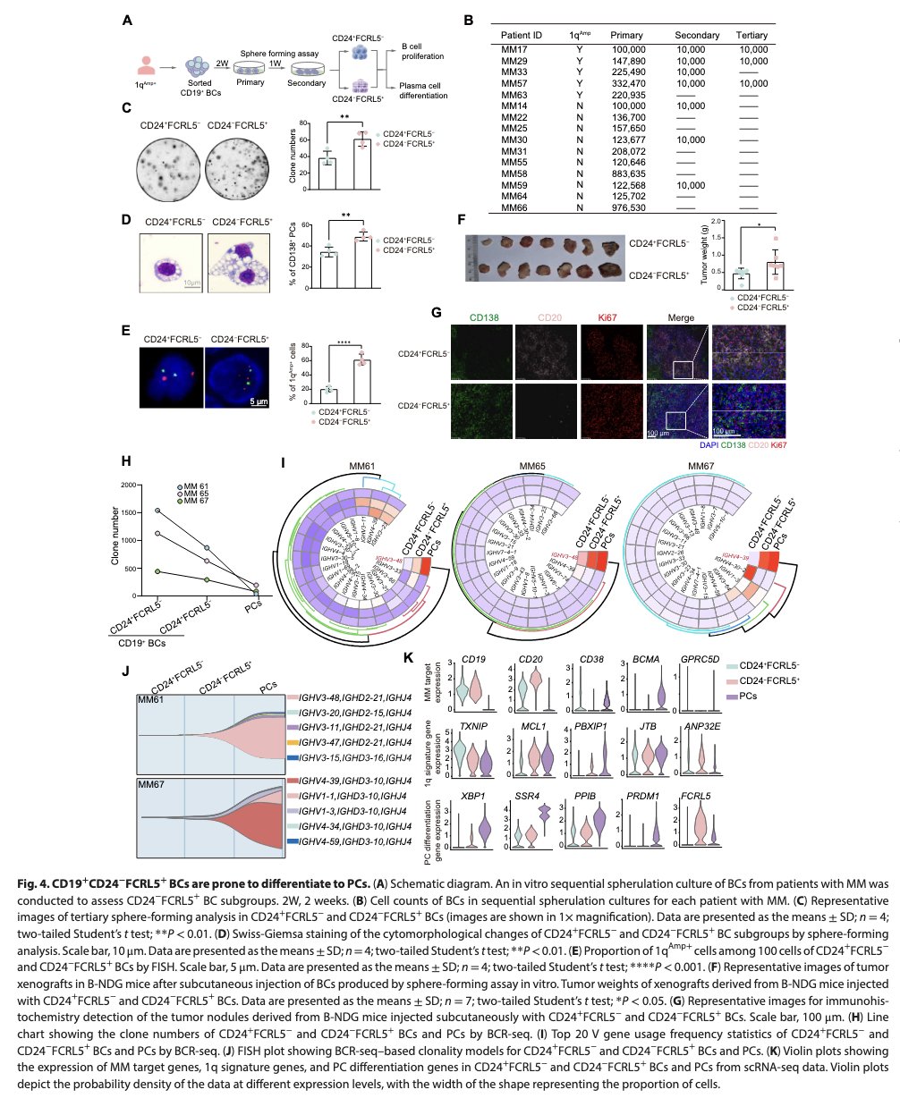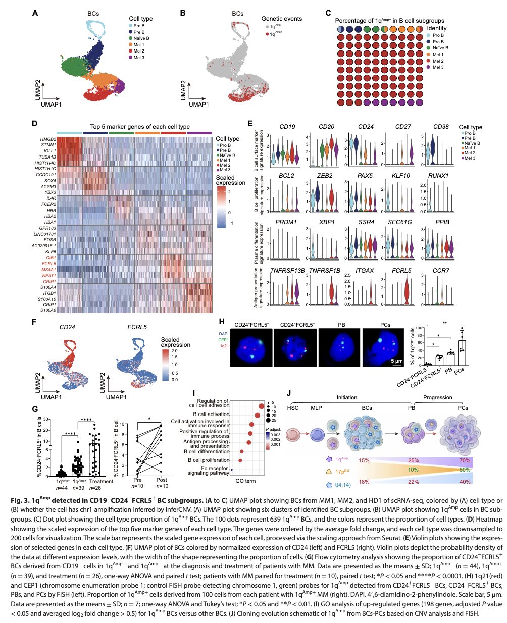 Study of malignant transformation in myeloma-initiating cells finds 1qAmp originates from CD24-FCRL5+ B-cells, del 17p occurs at plasma cell stage, and FCRL5 facilitated malignant plasma cells via interaction with IRF4/SPI1.”