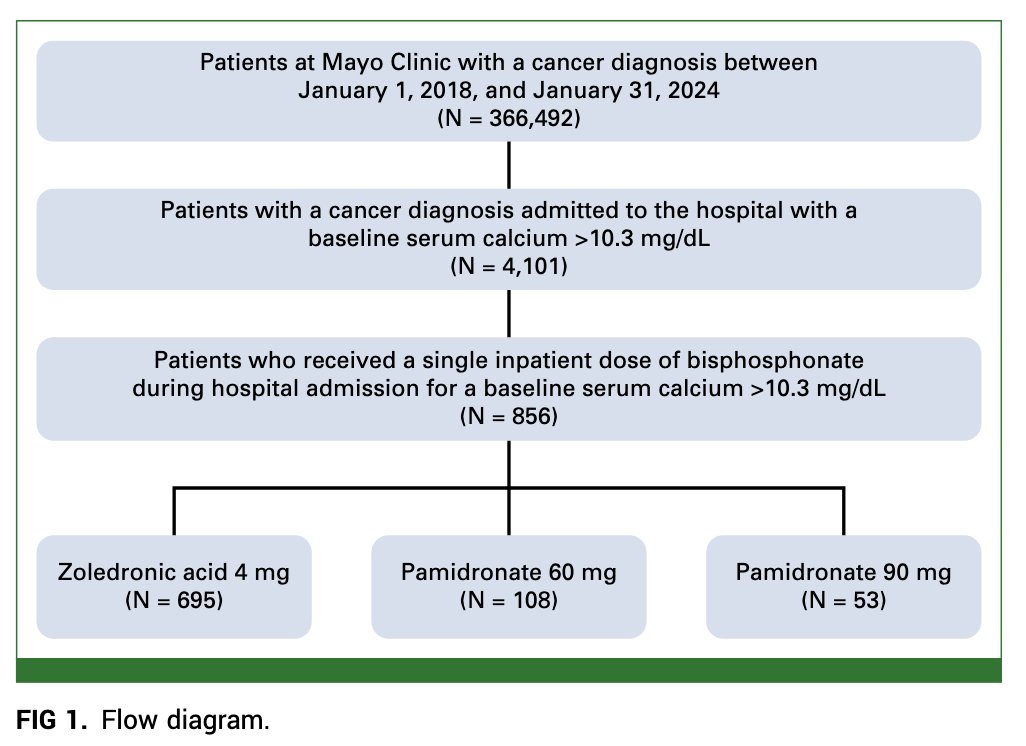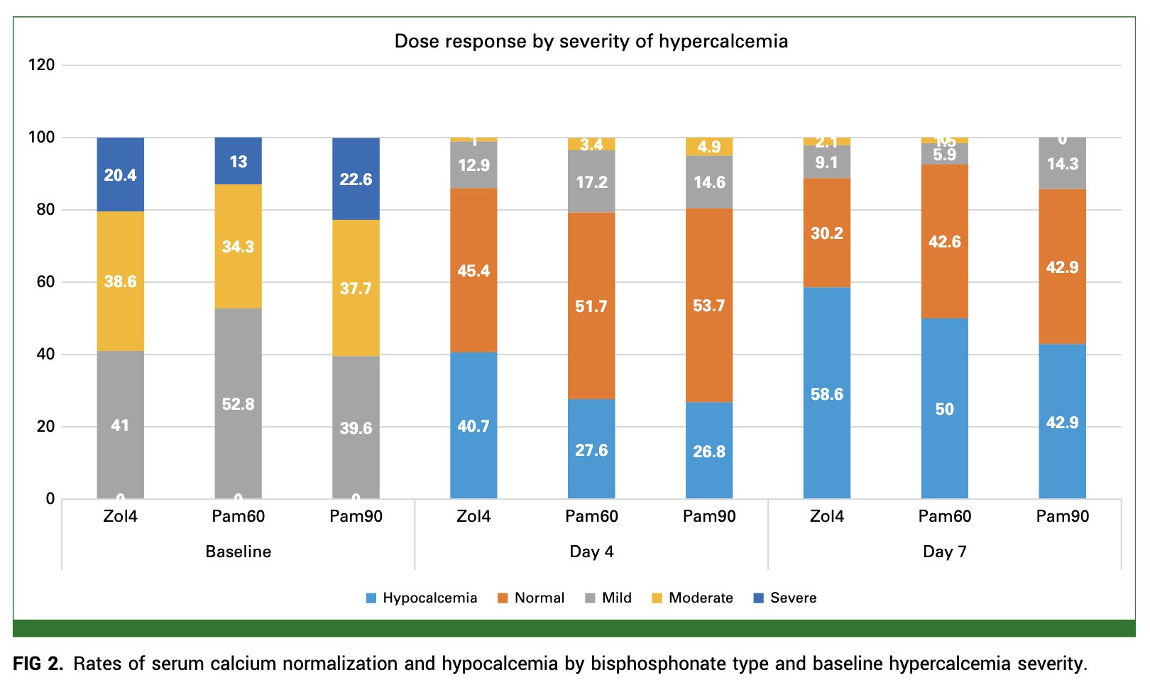 Study of efficacy and safety of bisphosphonate in hypercalcemia of malignancy finds rate of normalization similar between all bisphosphonates, significantly more hypocalcemia on day 4 with 4 mg zoledronic acid vs. pamidronate.”