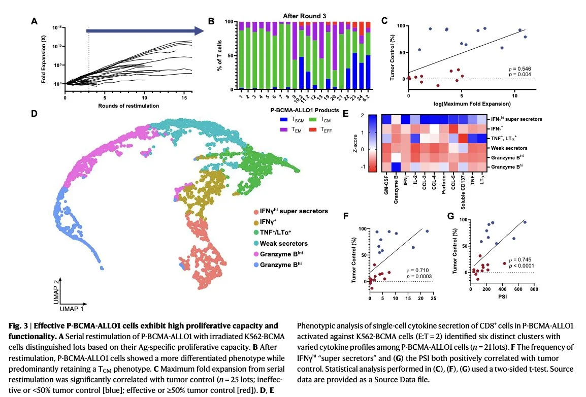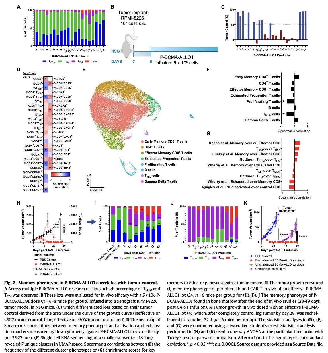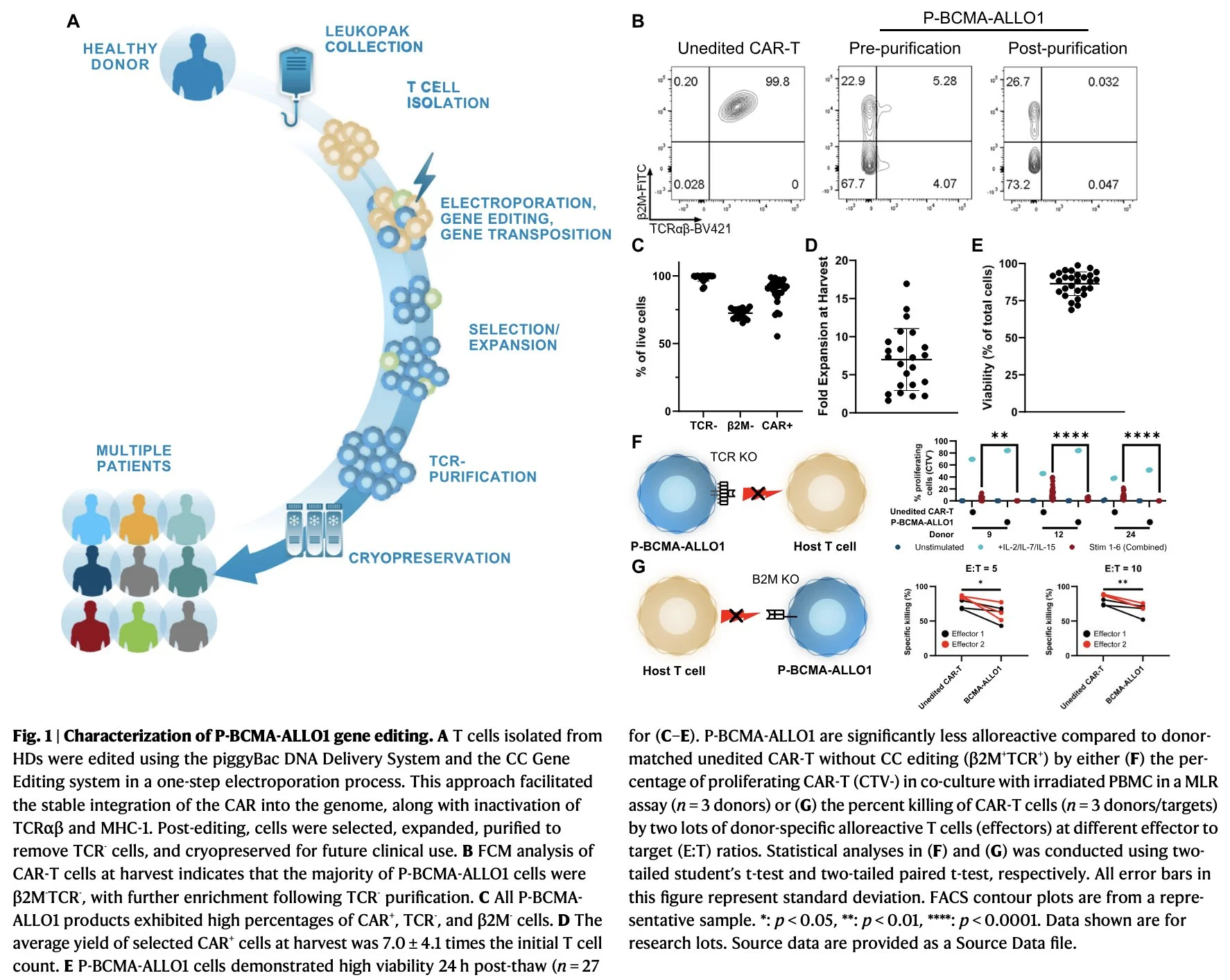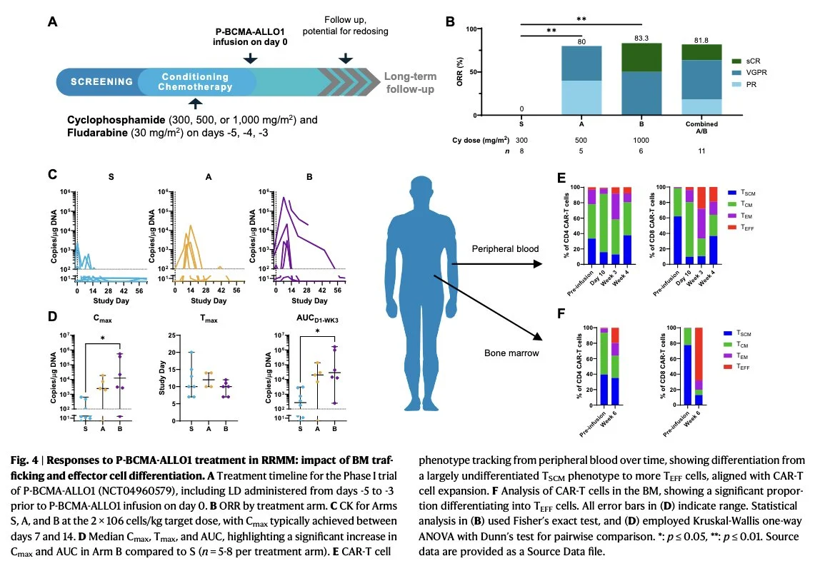 Phase I of P-BCMA-ALLO1, a TSCM-predominant allogeneic CAR-T targeting BCMA in heavily pretreated relapsed/refractory myeloma, shows 82% (9/11) ORR, 63.6% (7/11) achieving at least VGPR, CRS in 21.2% (7/33) (all grade ≤2).”