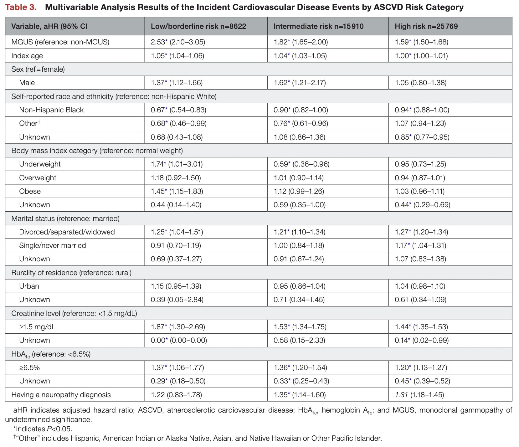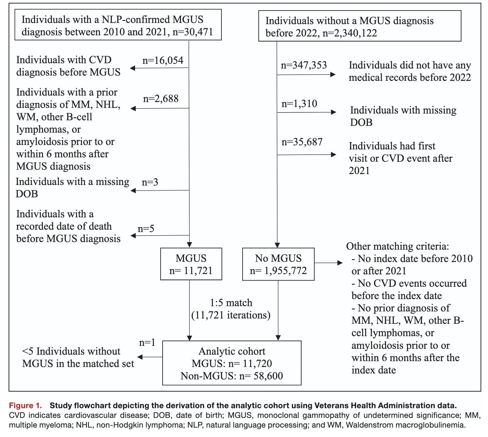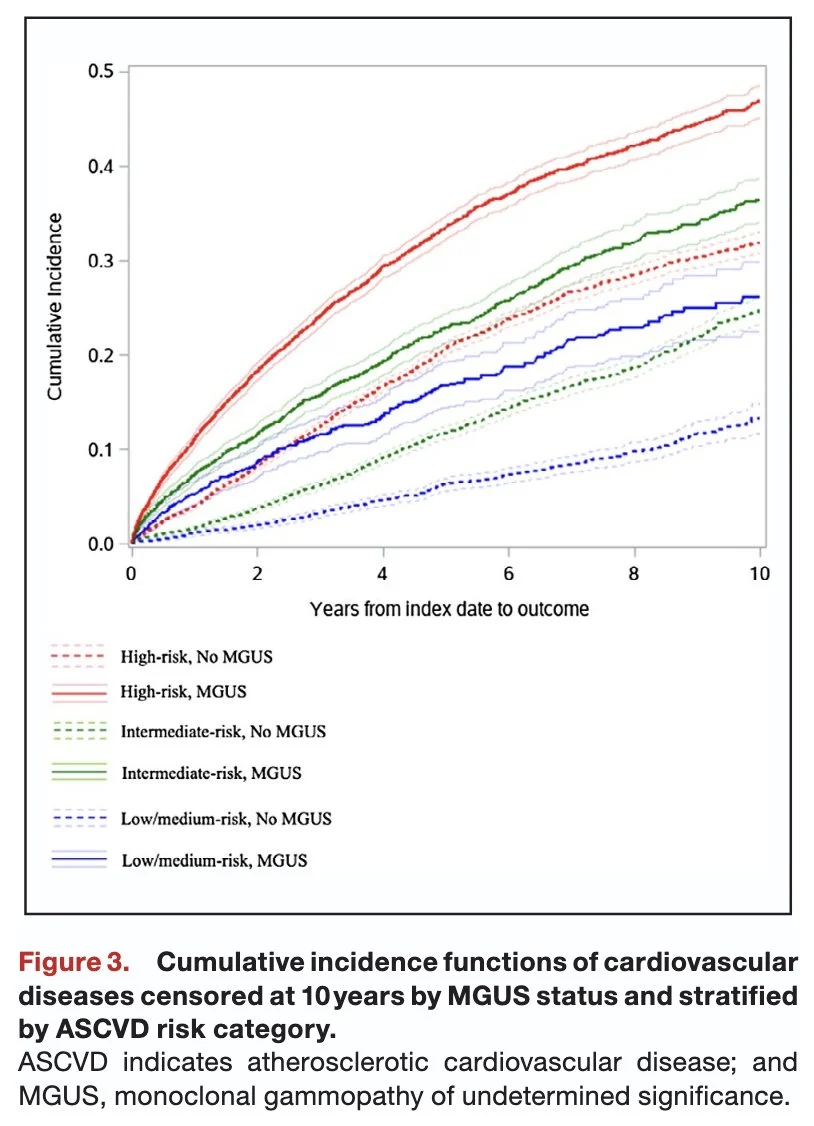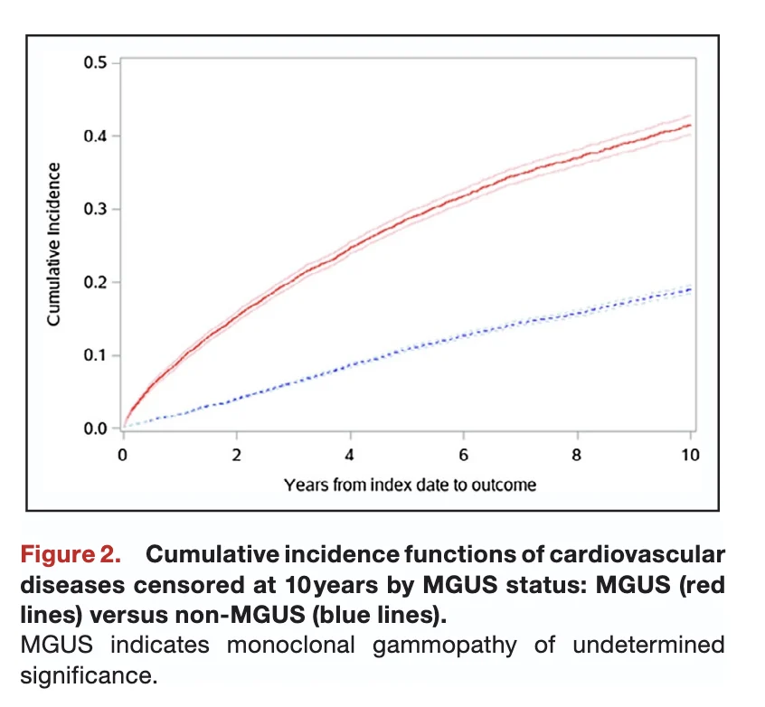 Matched observational study of 2010-2021 Veterans Health Administration data finds MGUS associated with higher 10-yr cardiovascular disease incidence (29.5% vs 9.7%; P<0.001) & risk (aHR, 1.70 [95% CI, 1.62-1.78]; P<0.001).”