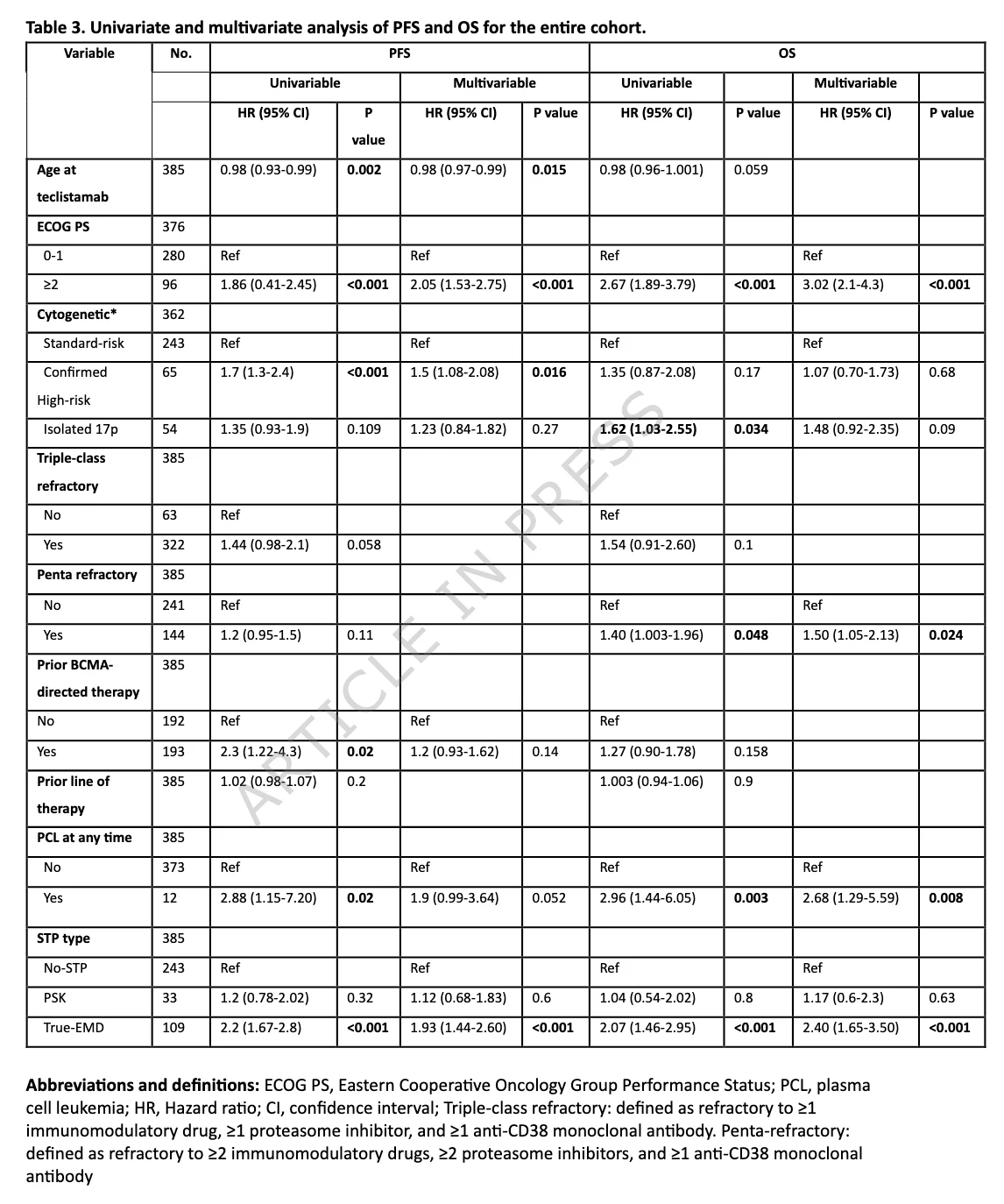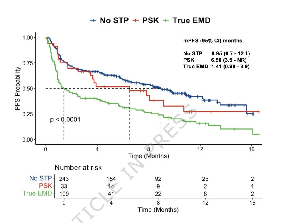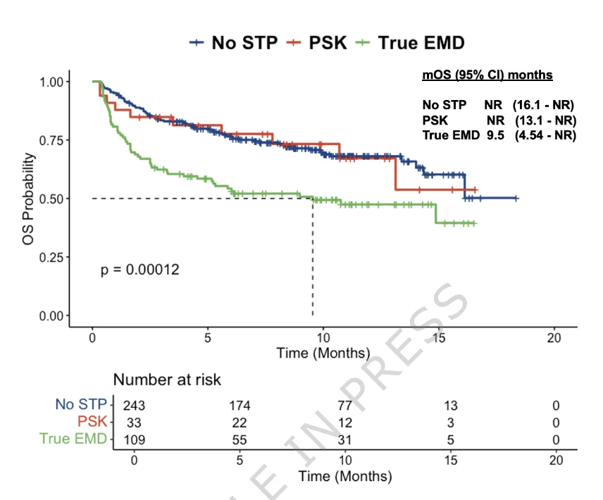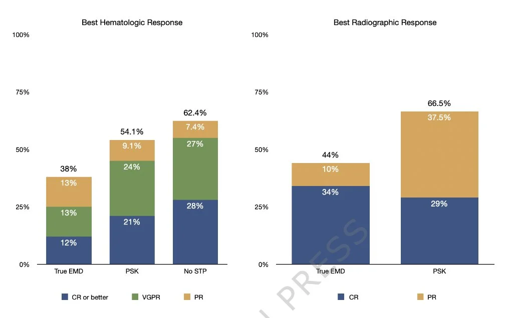 US Myeloma Immunotherapy Consortium data show median PFS with teclistamab of 1.4 mos in true-EMD, 6.51 mos with paraskeletal plasmacytomas, 8.95 mos in no soft tissue plasmacytomas; median OS 9.54, 13.1 months, and not reached.”