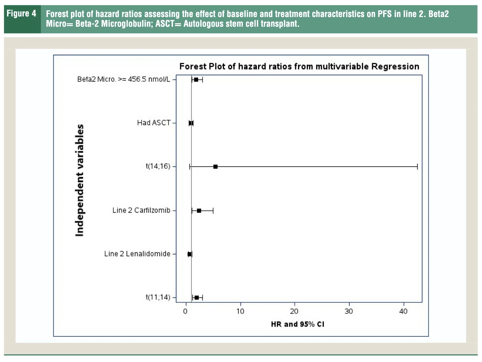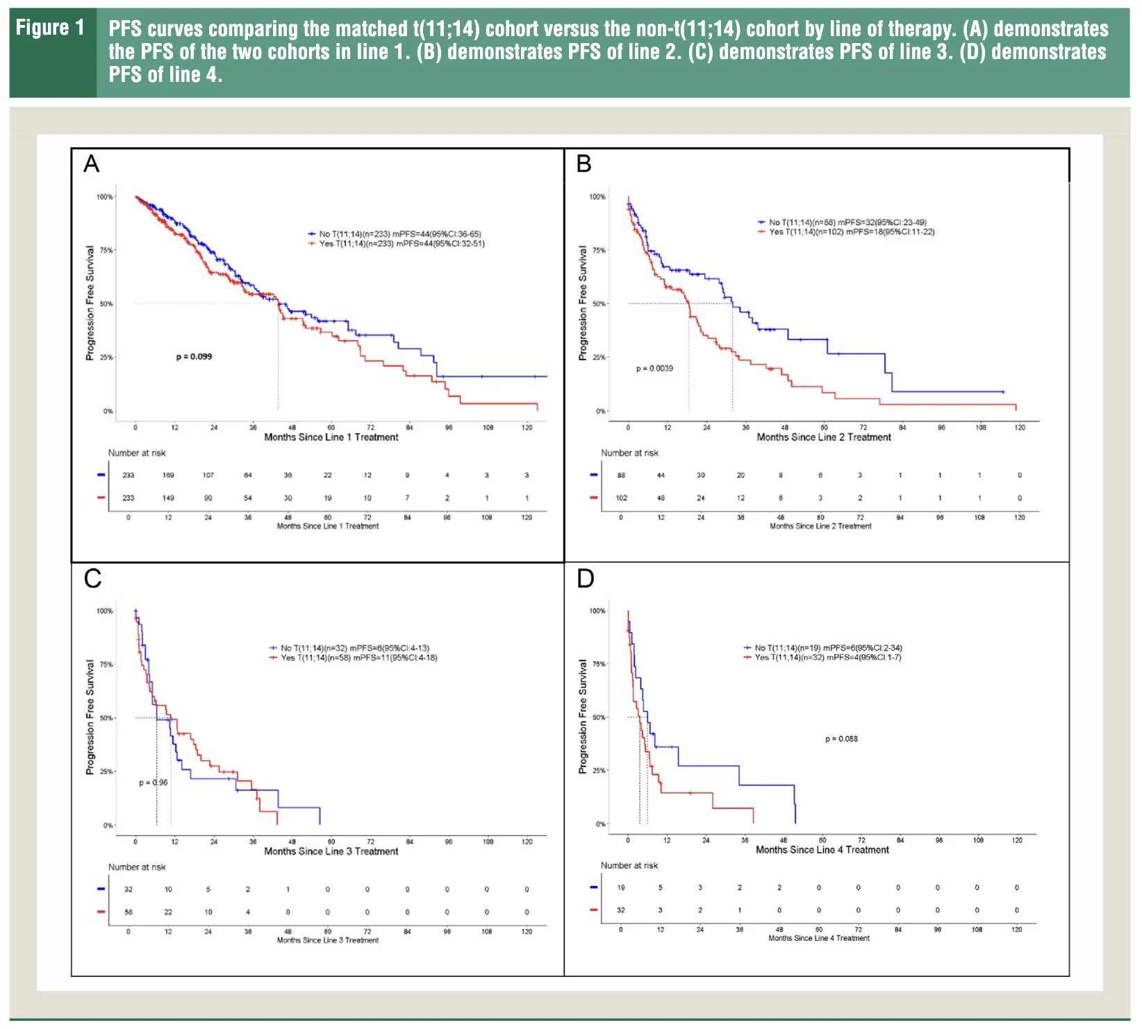 Matched comparison with the Canadian Myeloma Research Group National Clinical Database finds t(11;14) pts had similar PFS1 (44 (95% CI: 32-51) months vs. 44 (36-65), but shorter PFS2 (18 (95% CI: 11-22) months vs. 32 (23-49) months).”