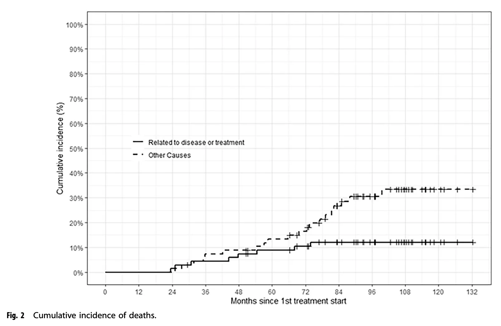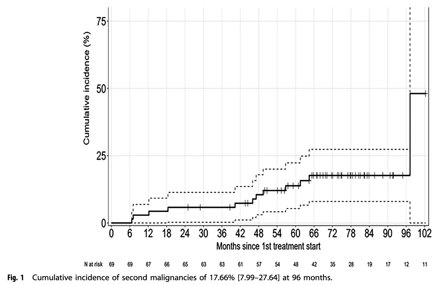 Long-term follow-up of bendamustine/rituximab for Waldenström macroglobulinemia finds median OS NR, PFS 82.2 mos (69.7–93.1), EFS 81.5 months, cumulative SPM incidence 2.9%, 5.8%, 10.5%, and 17.6% at 12, 24, 48, and 96 months.”