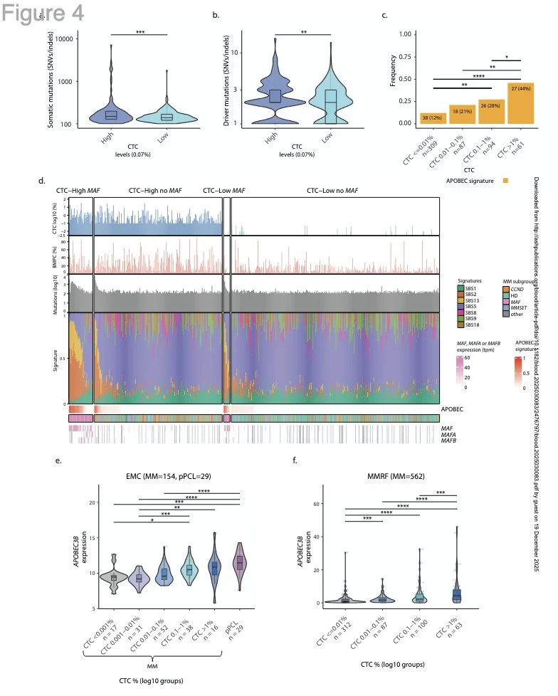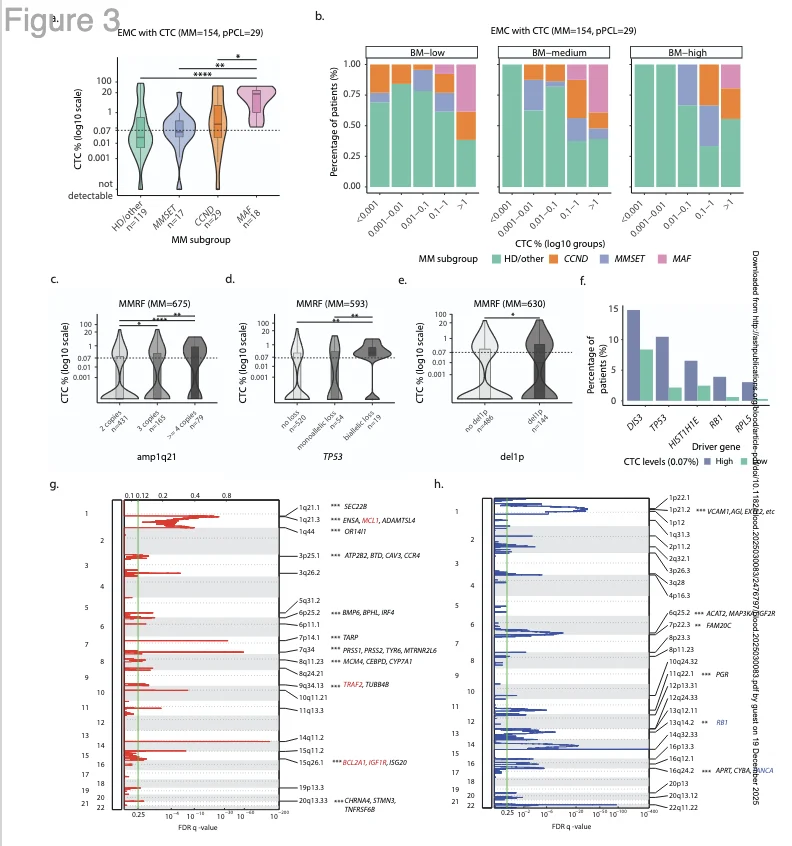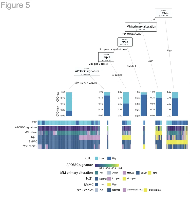 Circulating tumor cells (dependent on 1⁰ genomic events, high-risk 2⁰ events (amp 1q, del 1p, del 13q, biallelic TP53 mutations, increased APOBEC)) are a compound biomarker for BM high-risk genomic alterations/tumor load.”