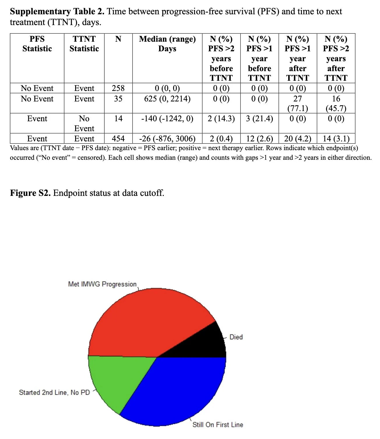 Real-world comparison of PFS and TTNT in 761 NDMM pts finds 92% ORR (≥CR 22.1%, VGPR 50.2%, PR 20.3%); 61.5% experienced a PFS and 64.3% a TTNT event at median f/u of 5.1 yrs; PFS typically preceded TTNT with a median of 26 days.”