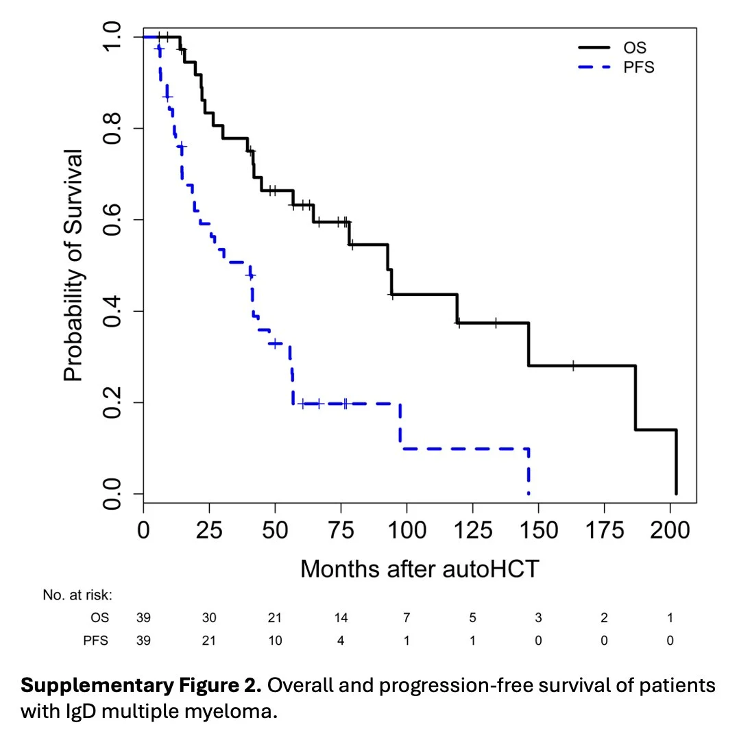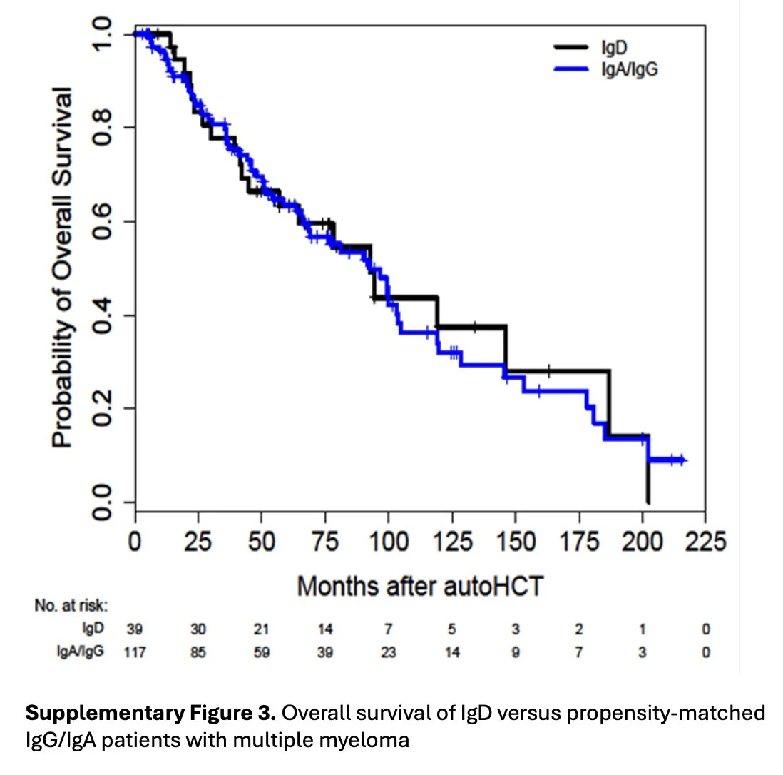 Propensity score-matched analysis finds no significant PFS (HR 1.41; 95% CI 0.84–2.38) or OS (HR 1.01; 95% CI 0.54–1.90) difference between IgD and IgG/IgA pts getting ASCT; results unchanged after adjustment for race and SCr.”