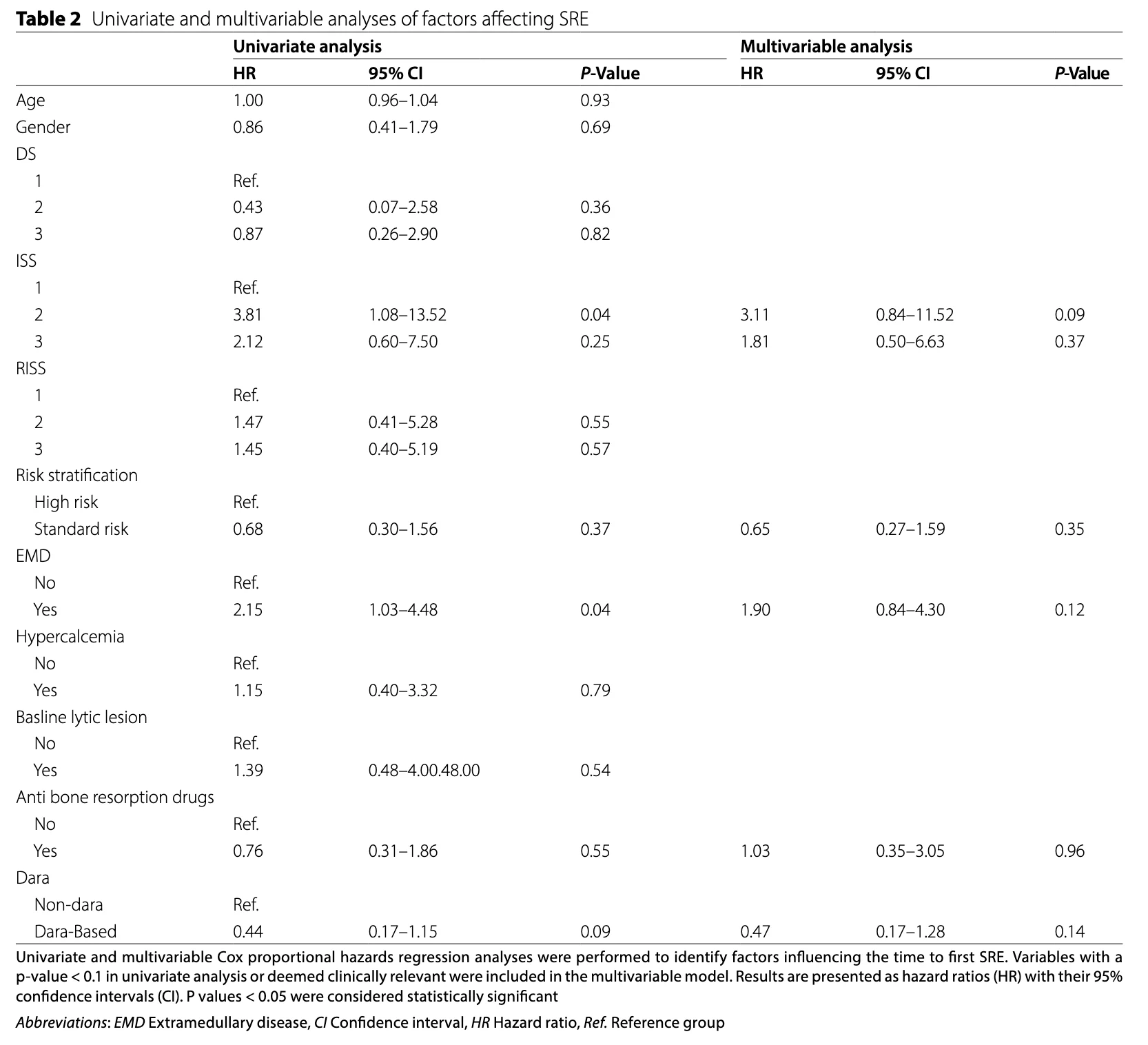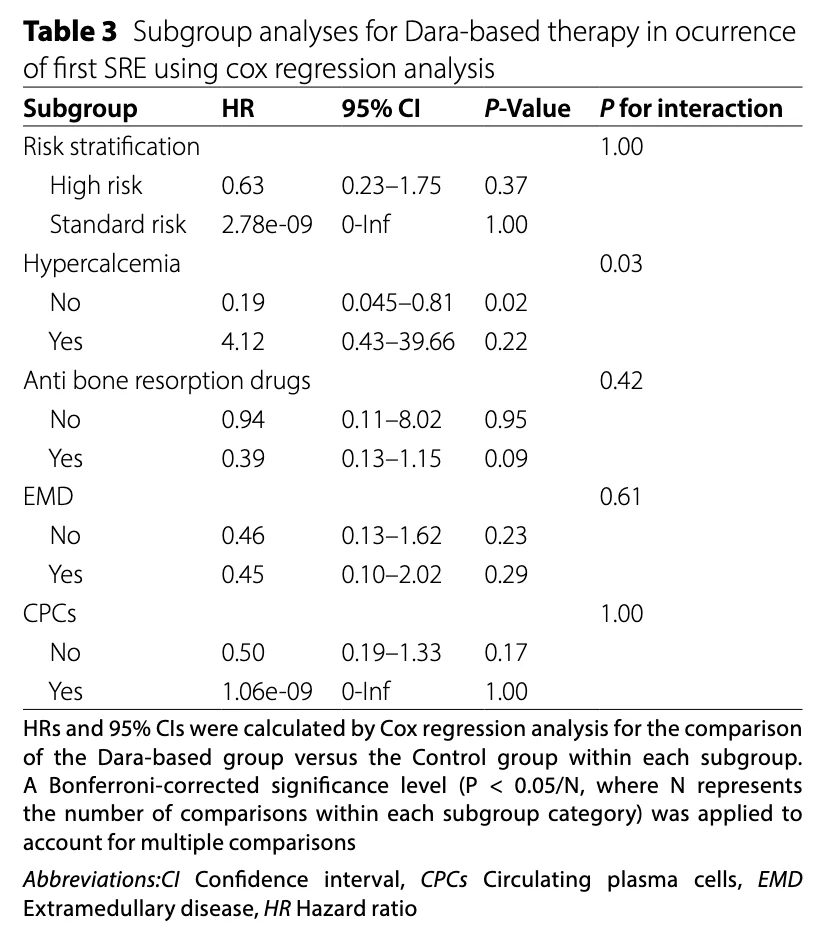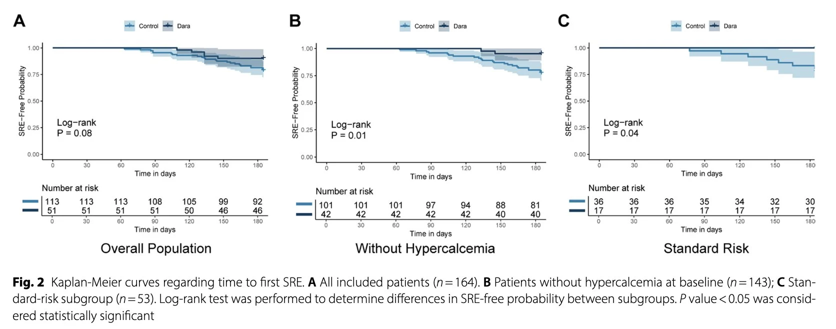 Multi-center retrospective study shows non-significant SRE reduction with Dara-based tx (HR=0.44, 95% CI 0.17-1.15, P=0.09); subgroup analyses find significant benefit in pts without baseline hypercalcemia and with standard-risk.”
