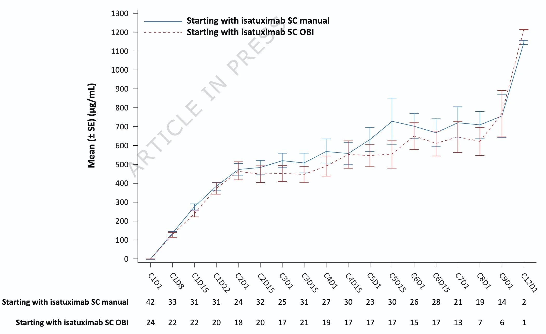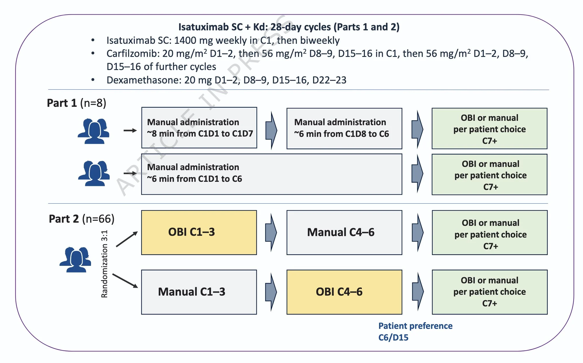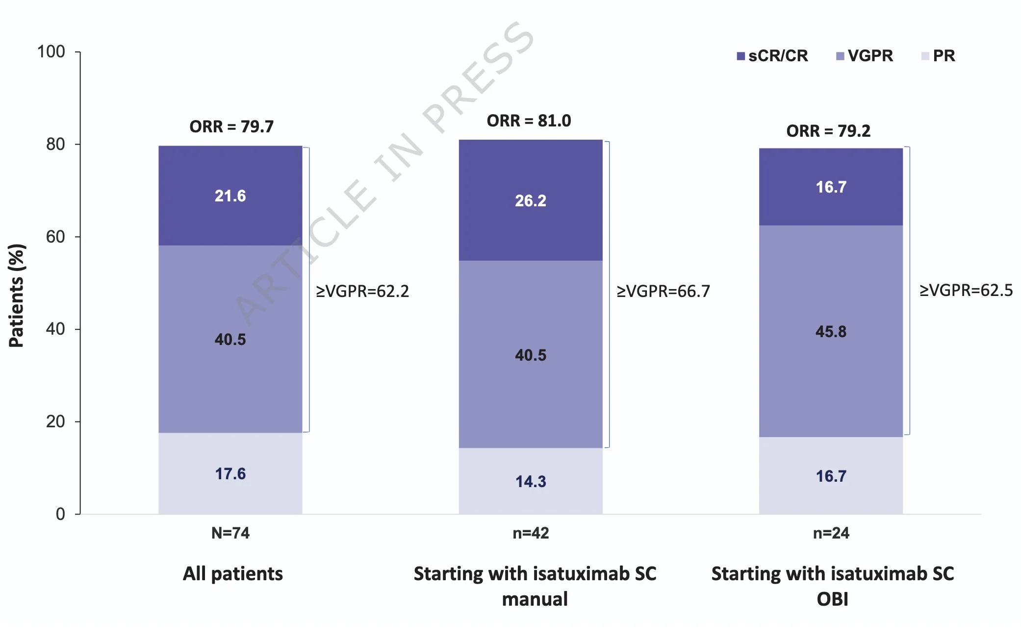 Phase 2 IZALCO study of subcutaneous isatuximab + car/dex in RRMM finds ORR of 79.7% (N = 74); 74.5% of pts preferred on body injector (OBI) vs. manual injection; no impact of OBI on efficacy, safety, PK, immunogenicity.”