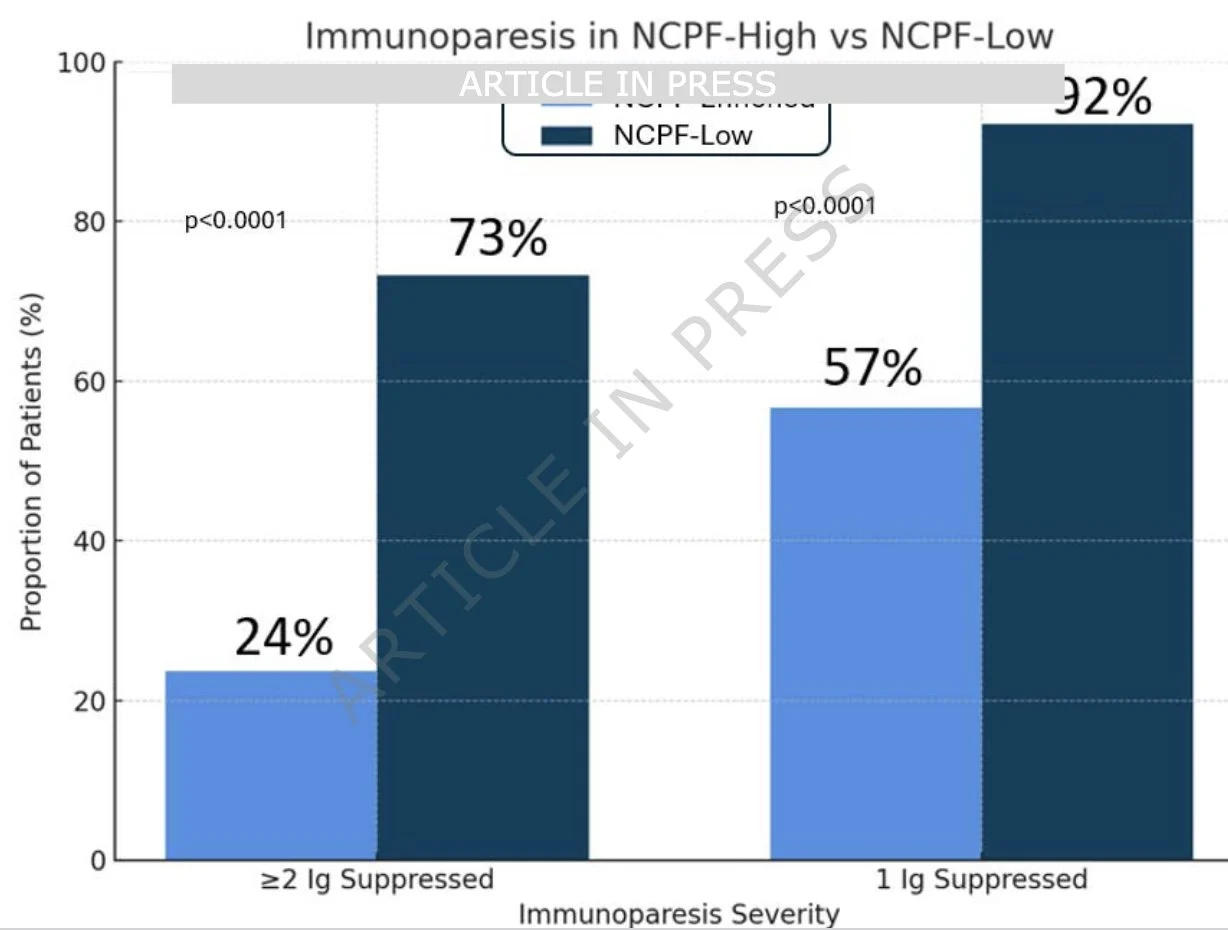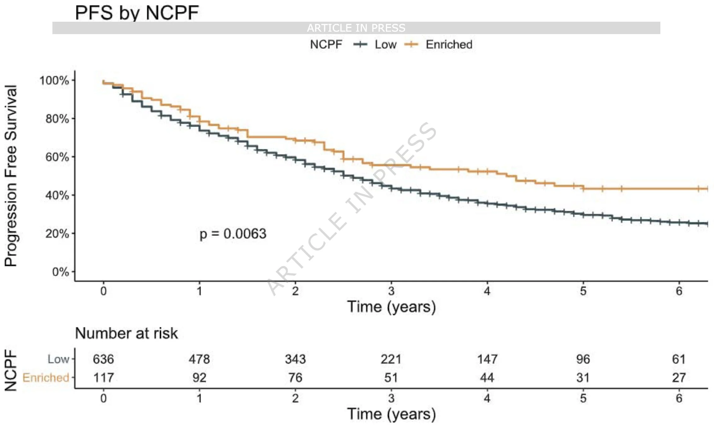 Elevated non-clonal bone marrow plasma cell fraction (NCPF) at diagnosis is associated with improved outcomes; 6-year OS significantly higher in NCPF-enriched pts (70.3% vs. 56.5%, p=0.0096); PFS also superior (HR 0.69, p = 0.006).”