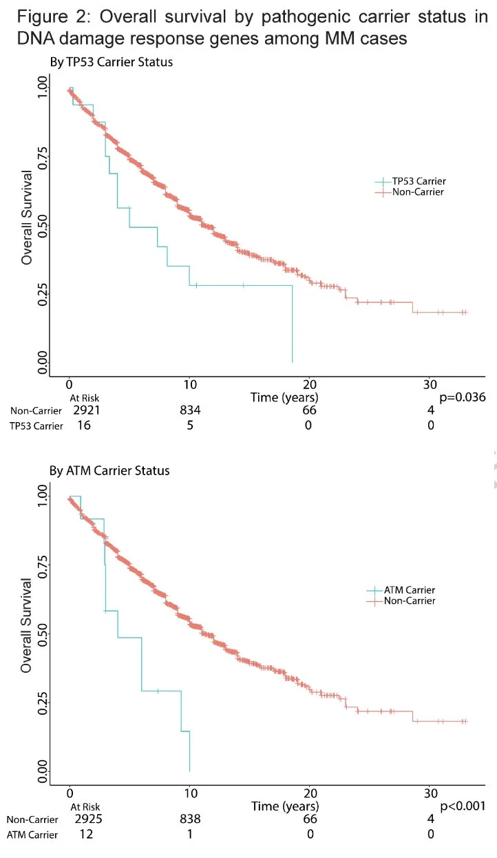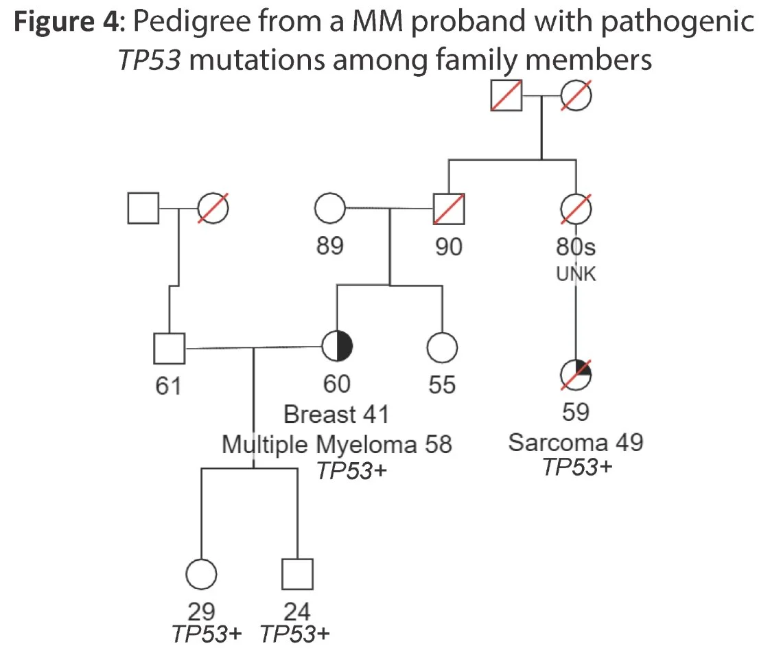 Increased myeloma risk found to be associated with inherited rare pathogenic mutations in TP53, ATM, CHEK2, KDM1A, and ARID1A, with an enrichment of these variants among individuals with early onset or family history.”