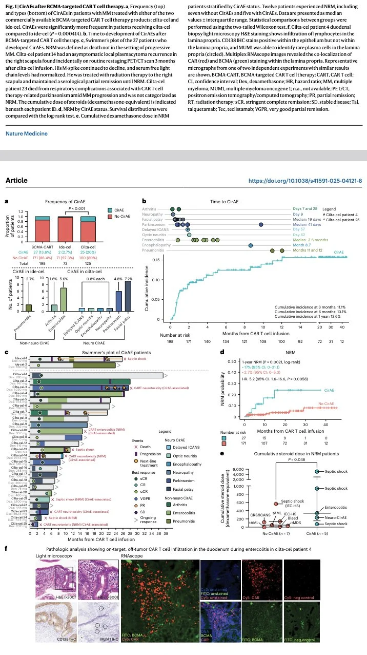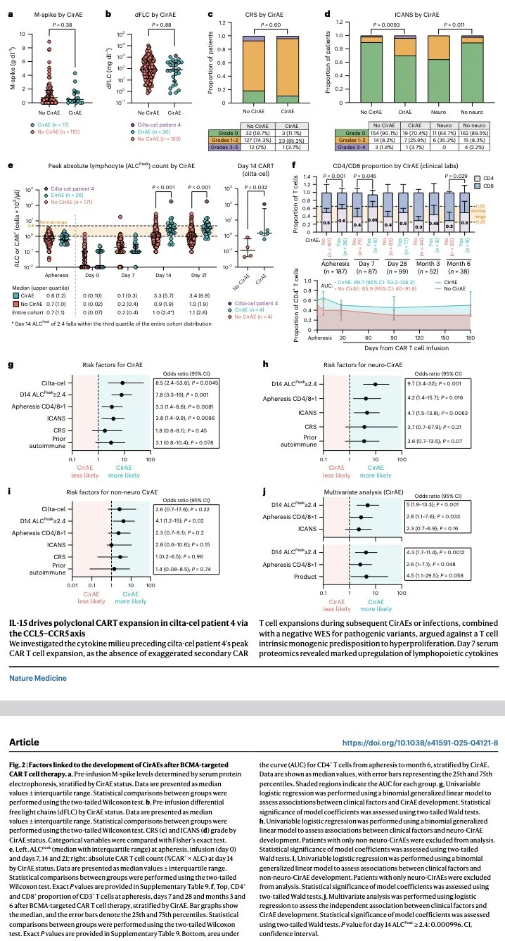 CD4+ T cells mediate CAR-T cell-associated immune-related AEs after BCMA CAR-T cell therapy; independent risk factors included cilta-cel, peak ALC ≥ 2.4 × 103 per microliter in the first 14 days, and apheresis CD4:CD8 ratio > 1.”