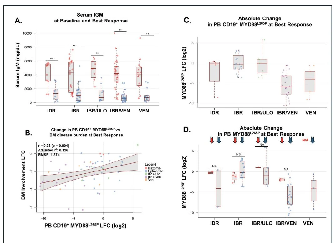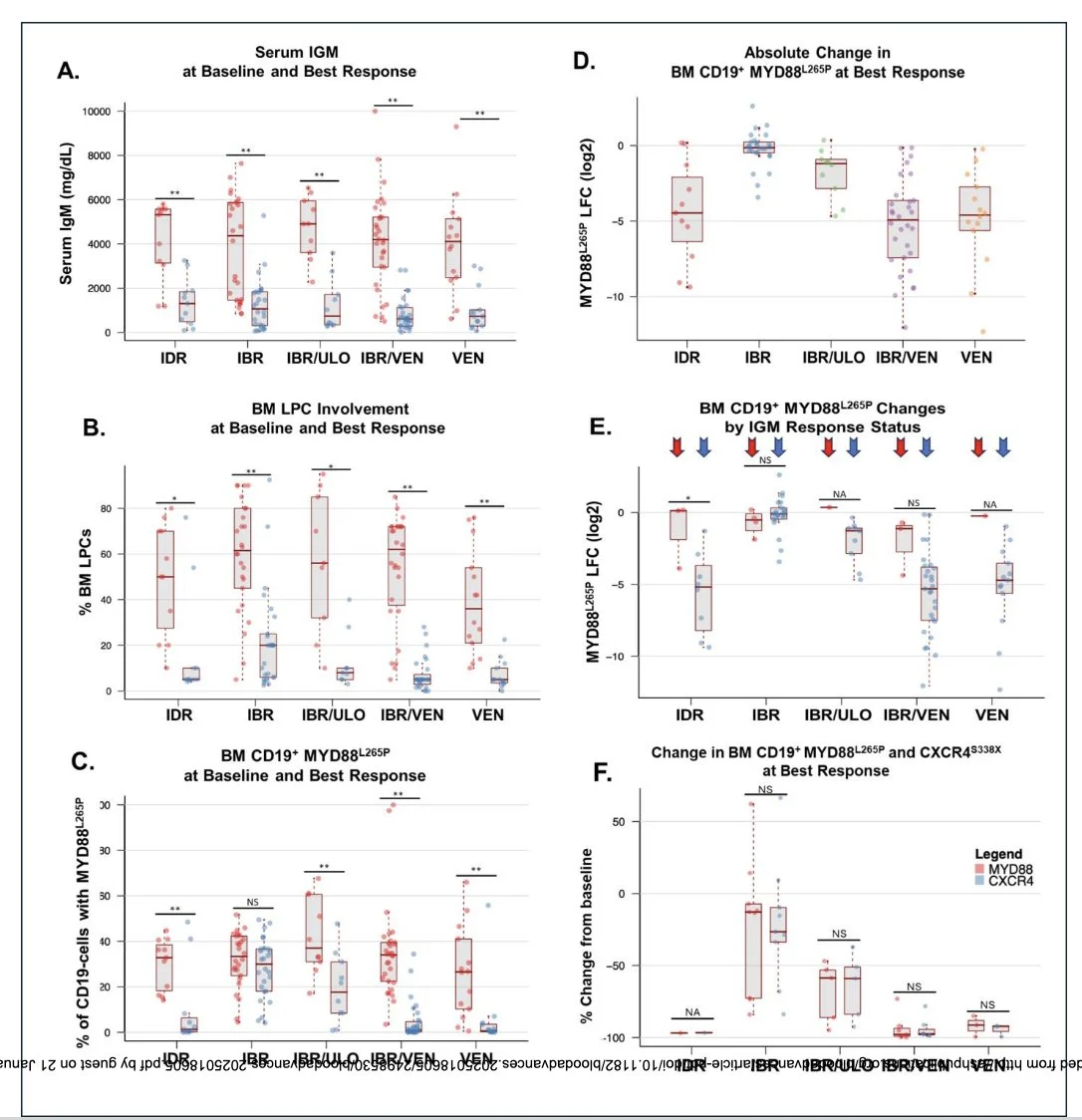 Quantitative MYD88L265P and CXCR4S338X analysis in blood and marrow by digital droplet PCR or cell-free DNA may contribute to better assessment of trial outcomes vs serum IgM level changes in Waldenstrom macroglobulinemia.”