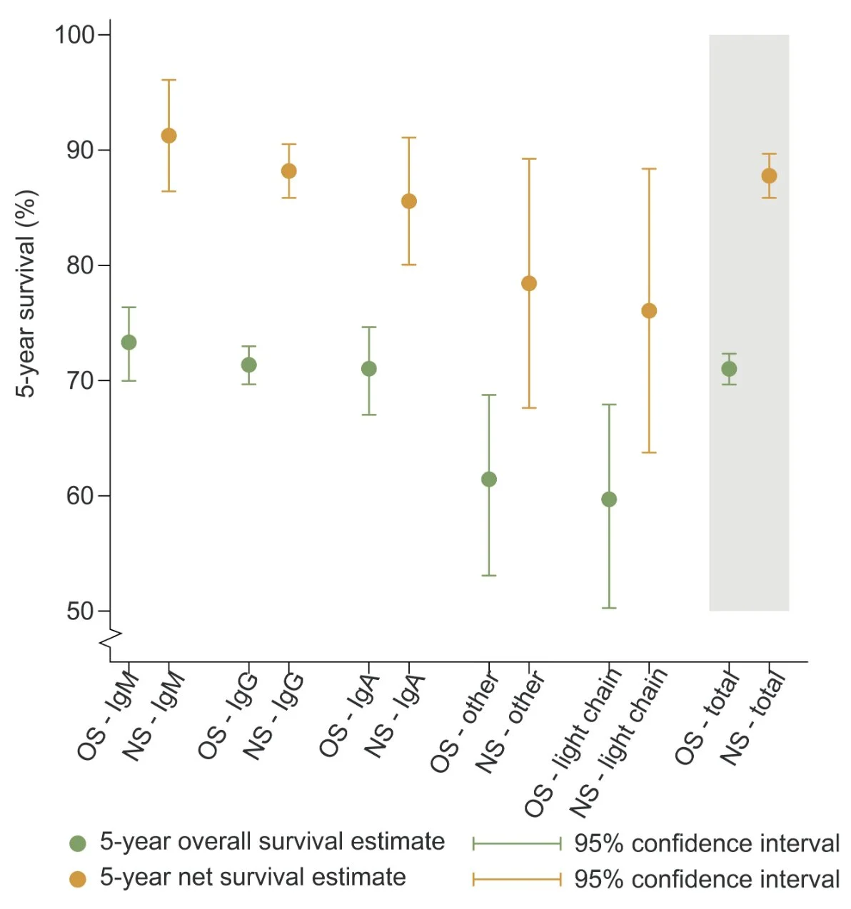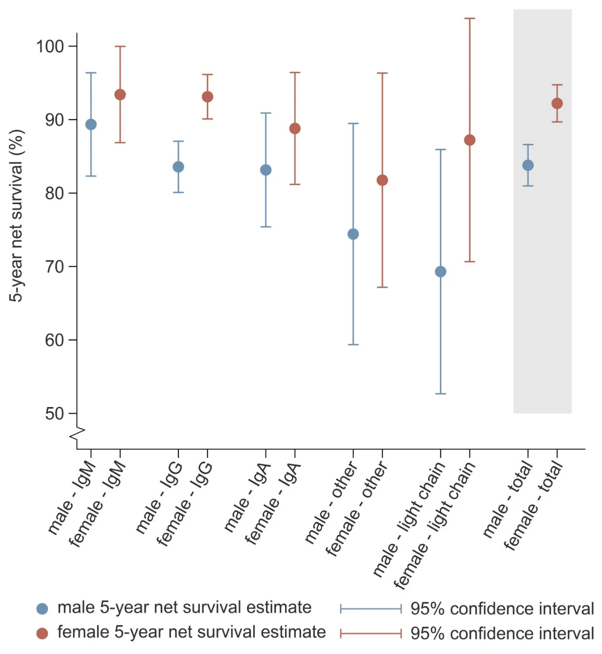 Study of UK population-based heme malignancies and premalignancies cohort finds 5-year net relative disease-specific estimate of survival of MGUS pts was 87.8% (95% Cl 85.9-89.7), with males more affected than females.”