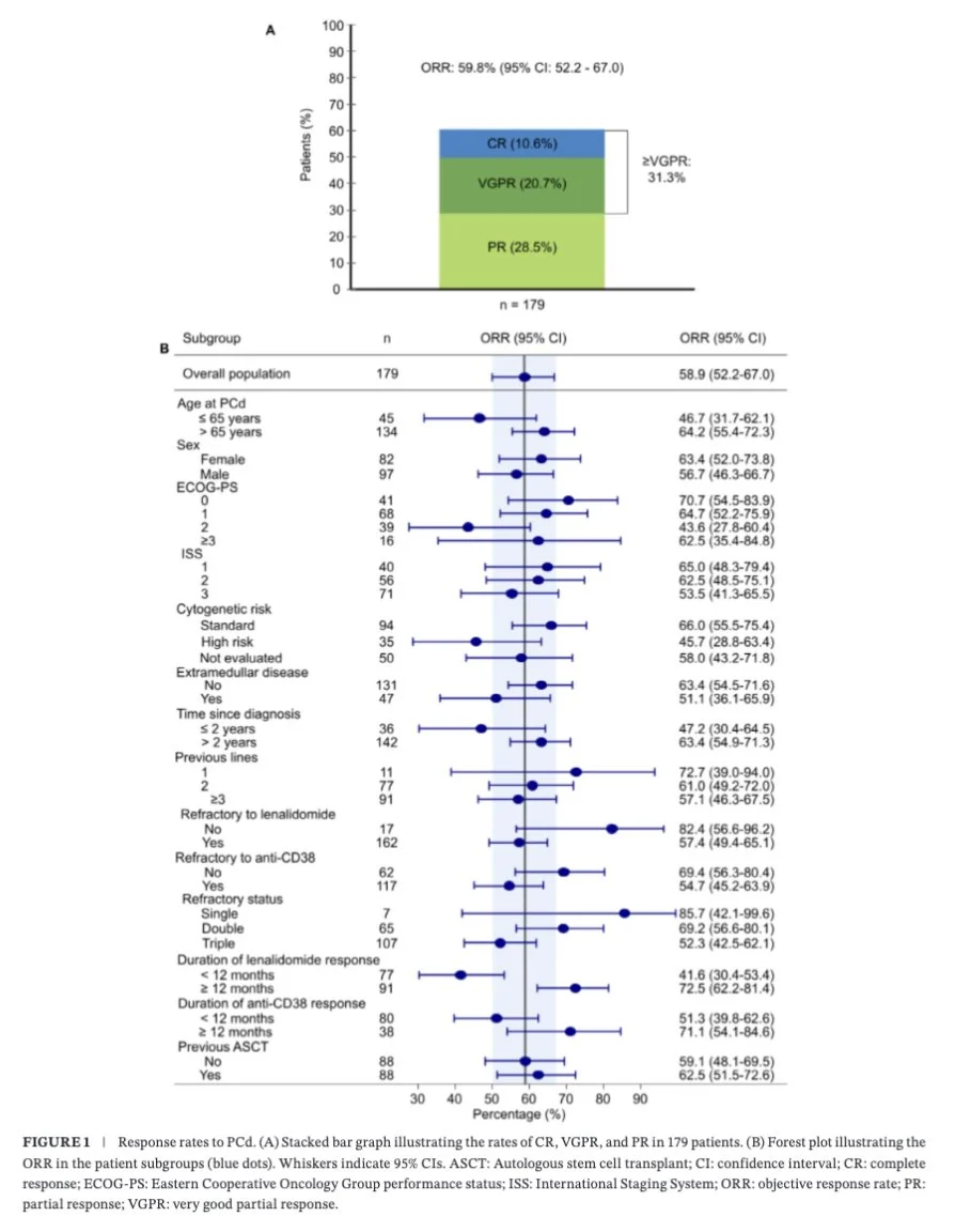 Pomalidomide, cyclophosphamide and dexamethasone (PCd) shows ORR of 59.8% in RRMM (52.3% in triple-refractory pts); median PFS & OS were 7.9 & 16.1 months; pts refractory to len & anti-CD38 had a median PFS of 7.6 months.”