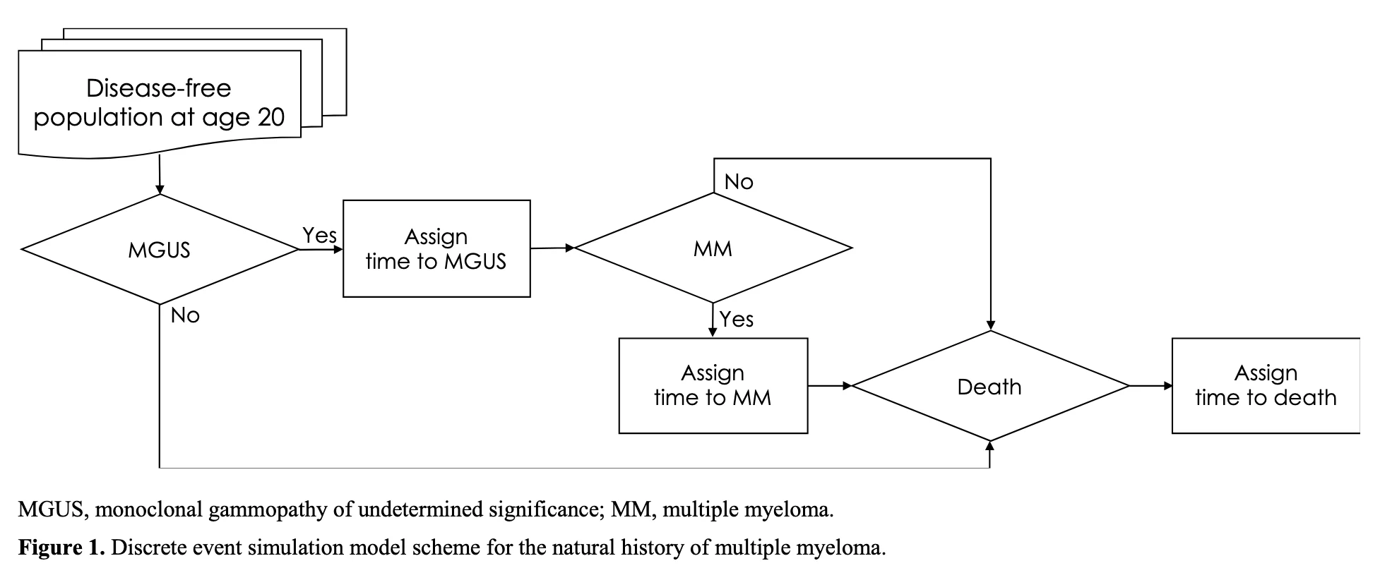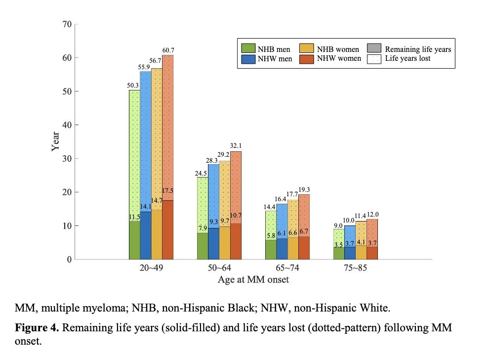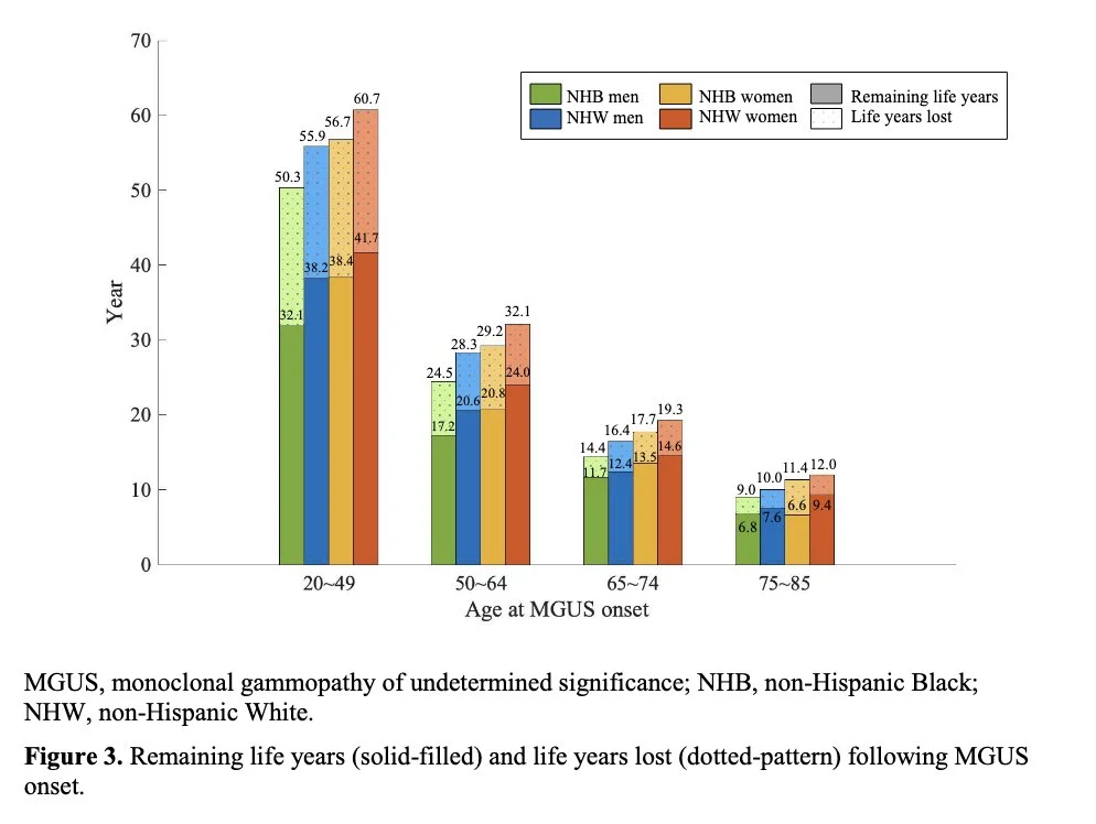 Modelling study finds life years lost associated with MGUS/MM was 7.6/14.2 (95% PI: 7.3-8.0/13.3-15.1), 8.0/16.0 (7.7-8.4/15.0-17.0), 8.4/16.0 (8.0-8.9/14.7-17.3) and 8.8/18.1 (8.4-9.2/16.9-19.4), in NHB men/women, NHW men/women.”