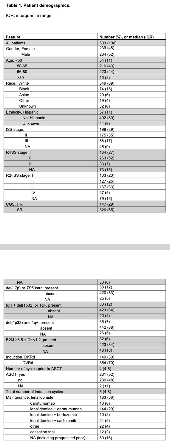 Authors: Kylee H. Maclachlan, Carlyn Rose Tan, Tala Shekarkhand, Colin J. Rueda, Andriy Derkach, Hamza Hashmi, Hani Hassoun, Urvi A. Shah, Malin L Hultcrantz, Alexander M. Lesokhin, Sham Mailankody, Francesco Maura, Maximillian Merz, Ross S. Firestone, Eric M. Jurgens, Kevin C. Miller, Sridevi Rajeeve, Sergio A. Giralt, Gunjan L. Shah, Michael Scordo, Heather J. Landau, Yanming Zhang, Robert Cimera, Maria E. Arcila, Neha Korde, Saad Z. Usmani