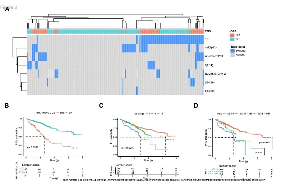 IMS-IMWG consensus genomic staging for defining high-risk NDMM patients predicts PFS (median 2.6 years in HR vs NR in SR (p<0.0001)); CGS risk remained predictive of PFS even in setting of MRD-negativity following ASCT.”