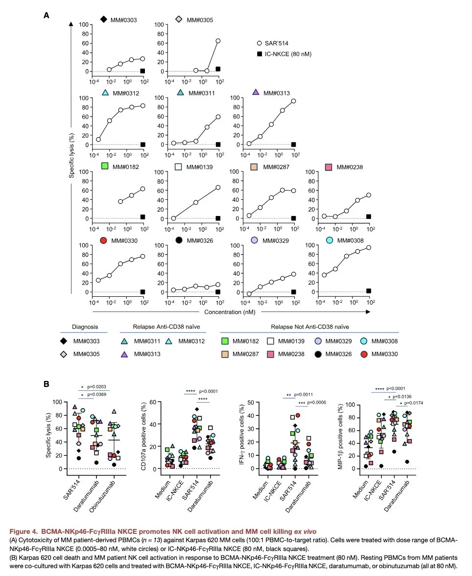 Trifunctional SAR445514 that co-engages NKp46 and FcγRIIIa to activate NK cells and targets BCMA has potent and selective anti-tumor activity in vitro/in vivo, outperforming FcγRIIIa-immune cell engagers while inducing low CRS.”
