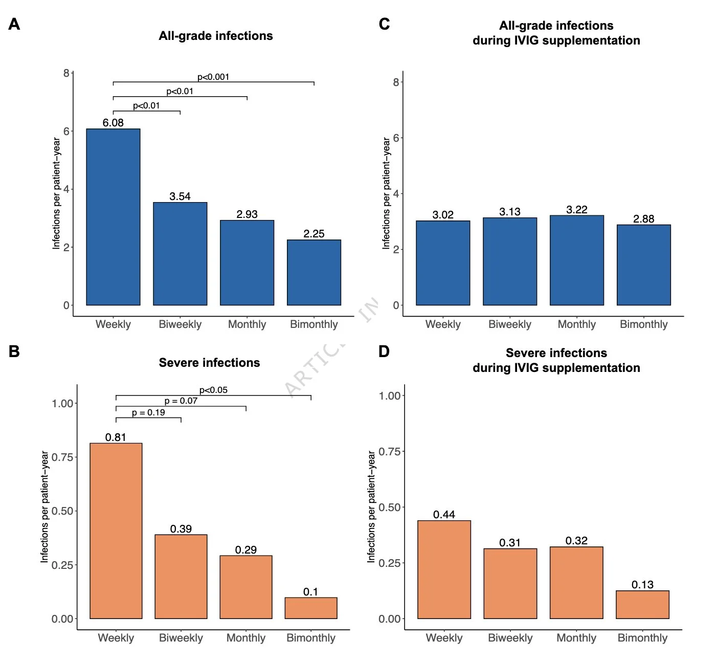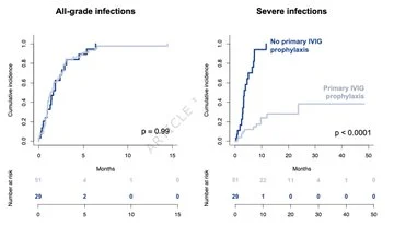Reduced risk of infections in pts w/ relapsed/refractory myeloma treated w/ BCMA TCE teclistamab by Ig supplementation (all-grade infxns 4.41 vs. 3.15 per pt-yr) and longer dosing intervals (from 6.08 infxns/pt-yr to 2.25).”