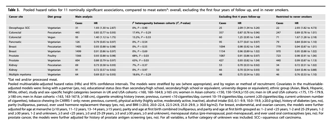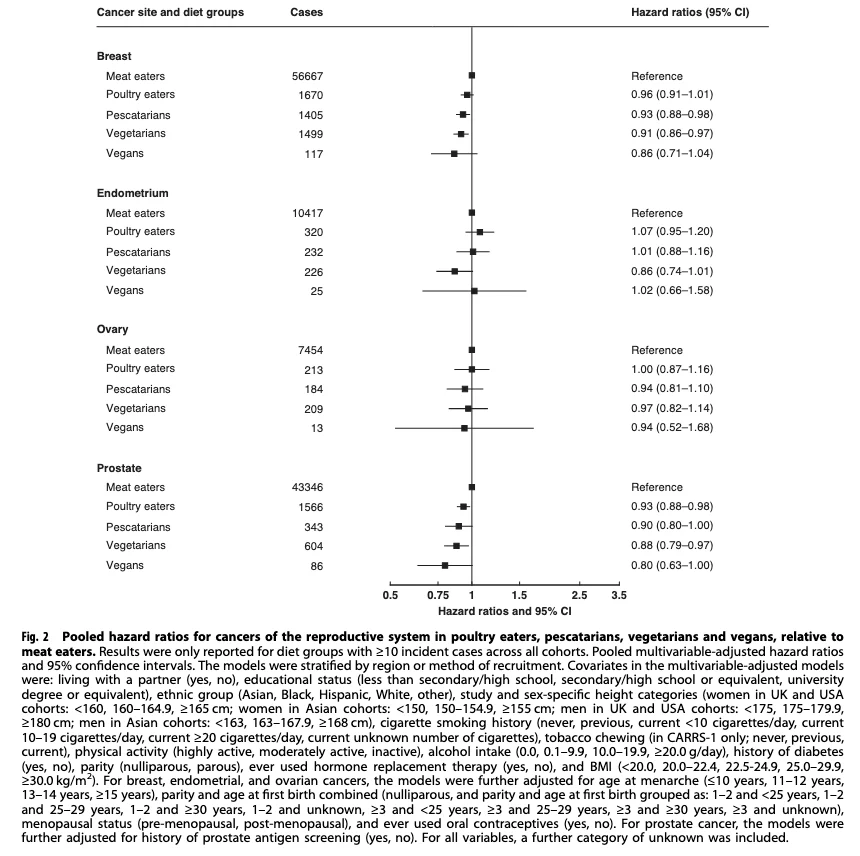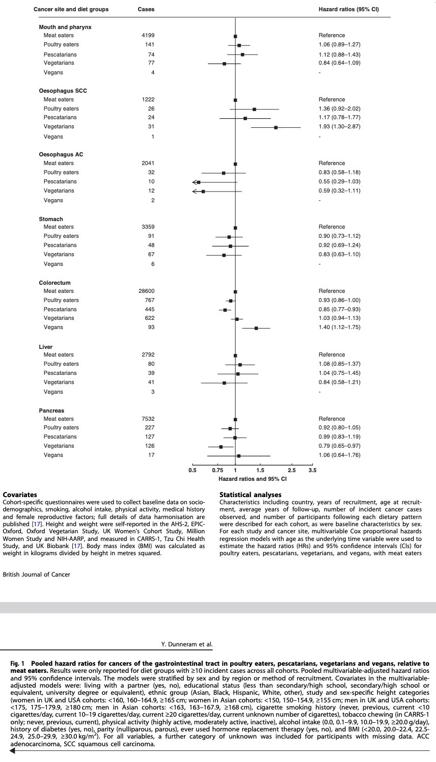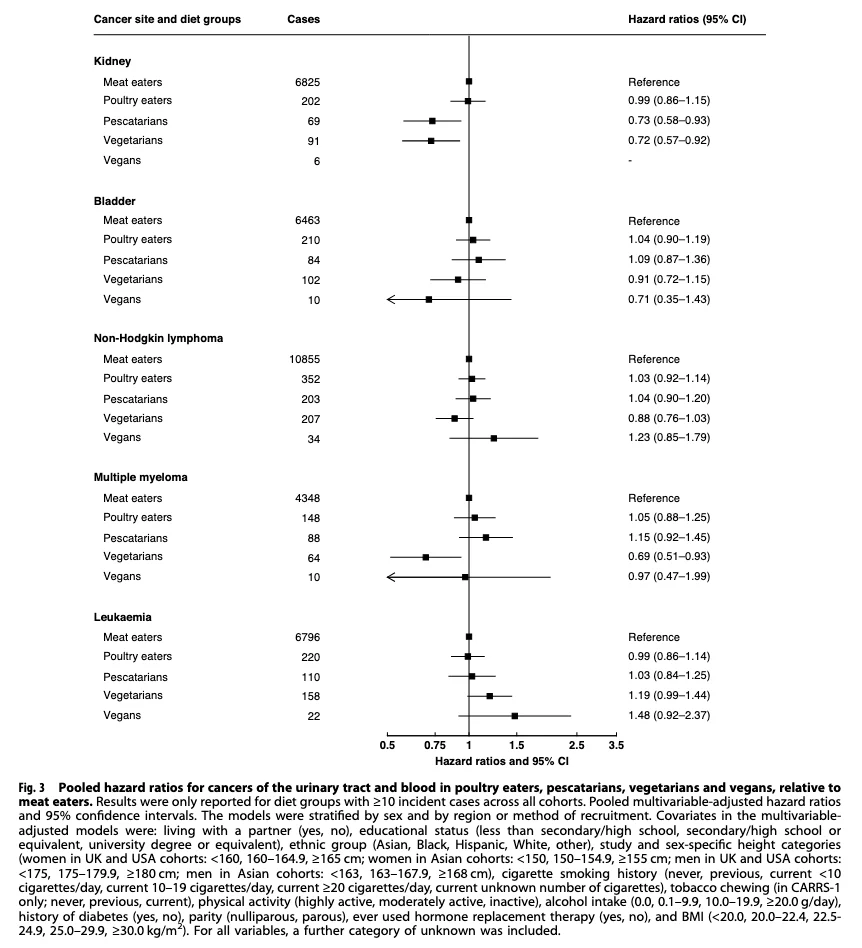 Pooled analysis of 1.8 million women and men in 9 prospective studies on 3 continents finds vegetarian diets reduced risk of myeloma (HR 0.69, CI 0.51-0.93), but increased risk of squamous cell ca esophagus and colorectal ca.”