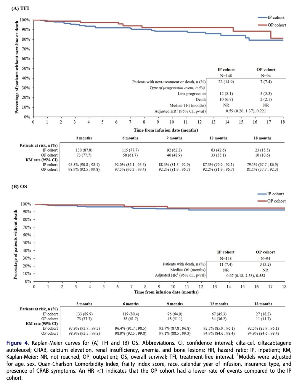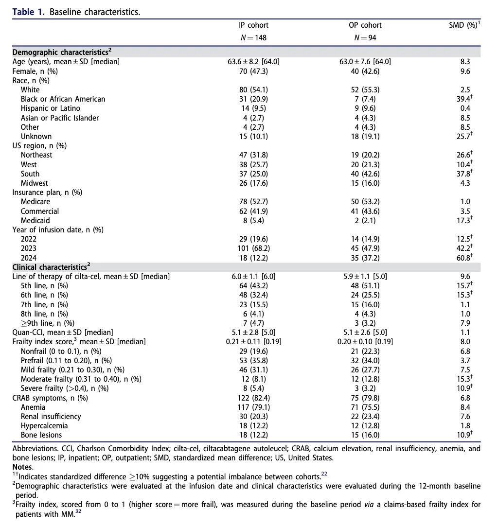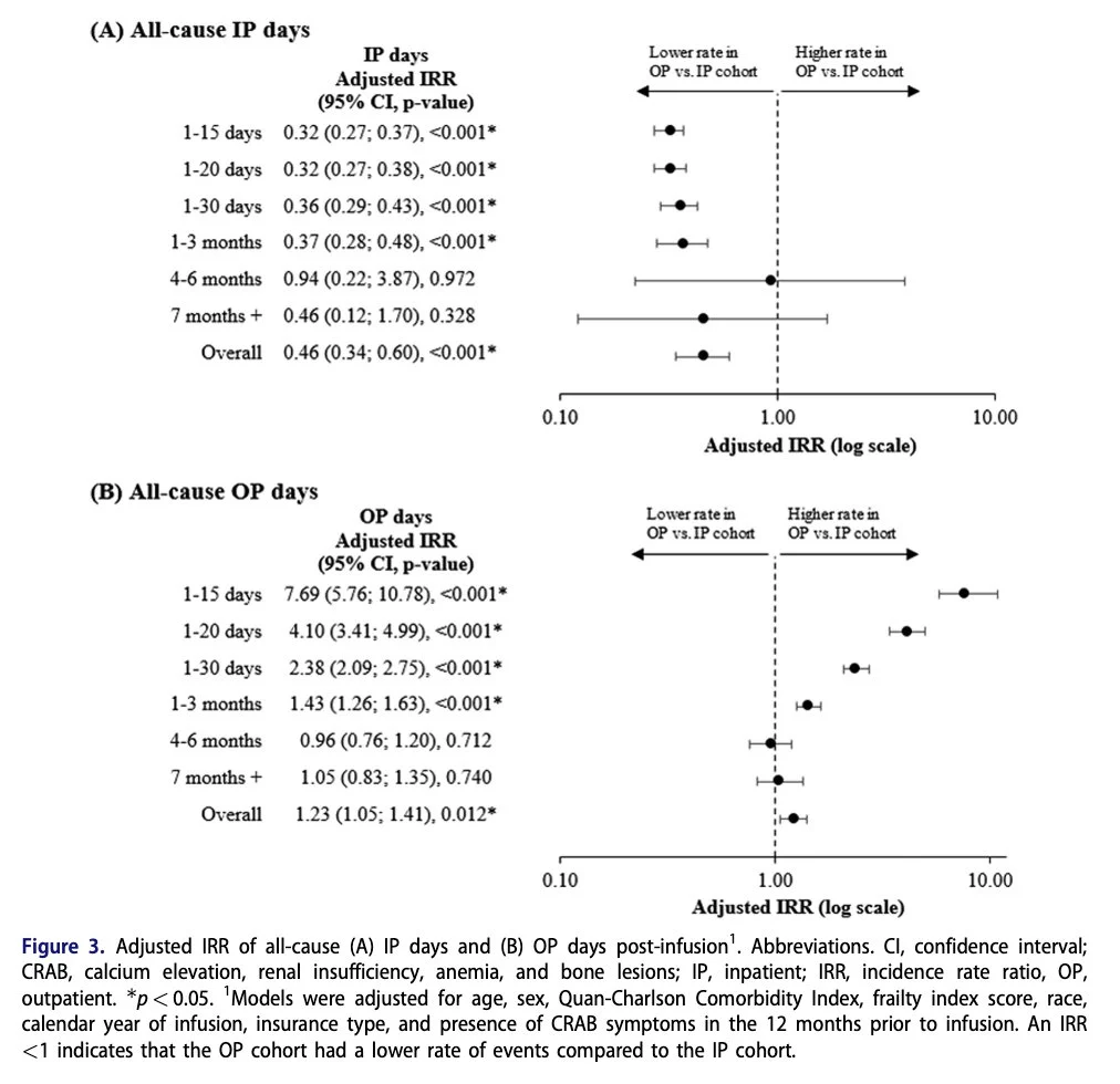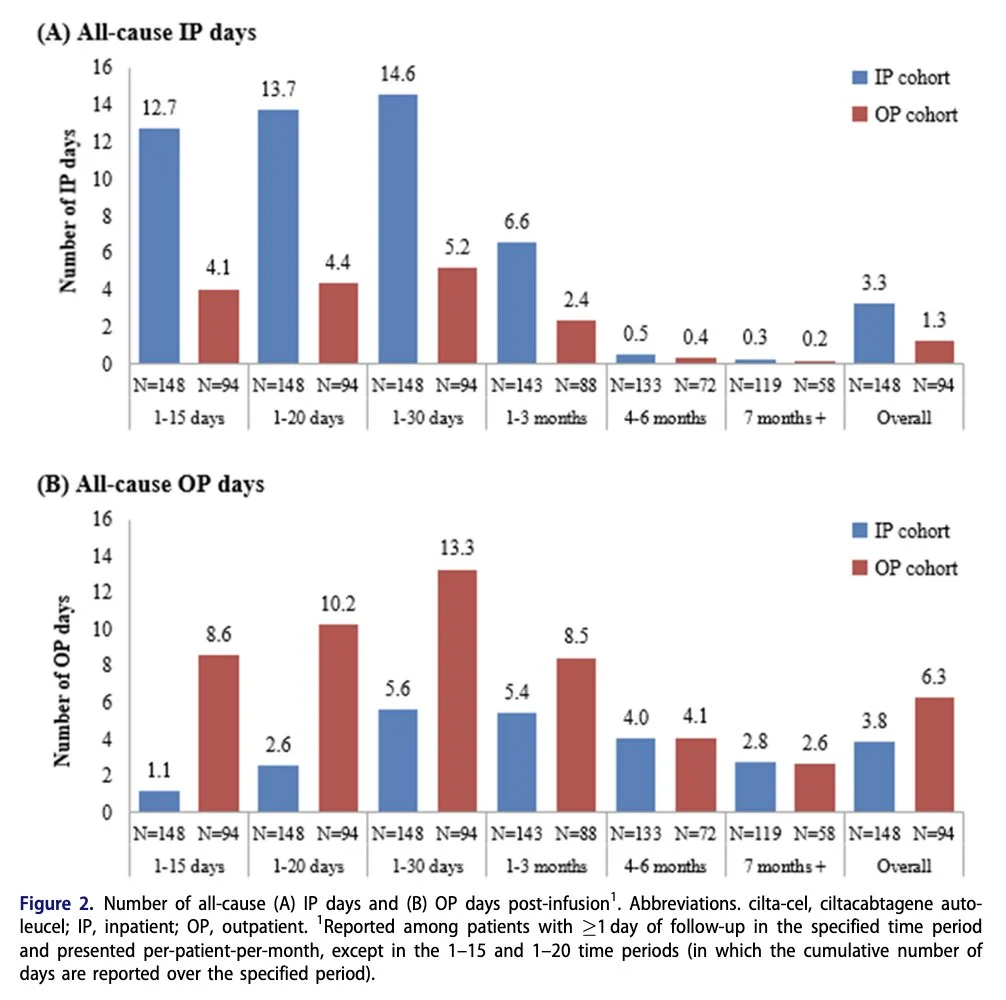 Outpatient administration of cilta-cel may yield similar effectiveness and safety outcomes relative to inpatient (IP) administration while significantly reducing IP resource use (fewer IP days/pt/mo (2.4 vs. 6.6; p<0.001)).”