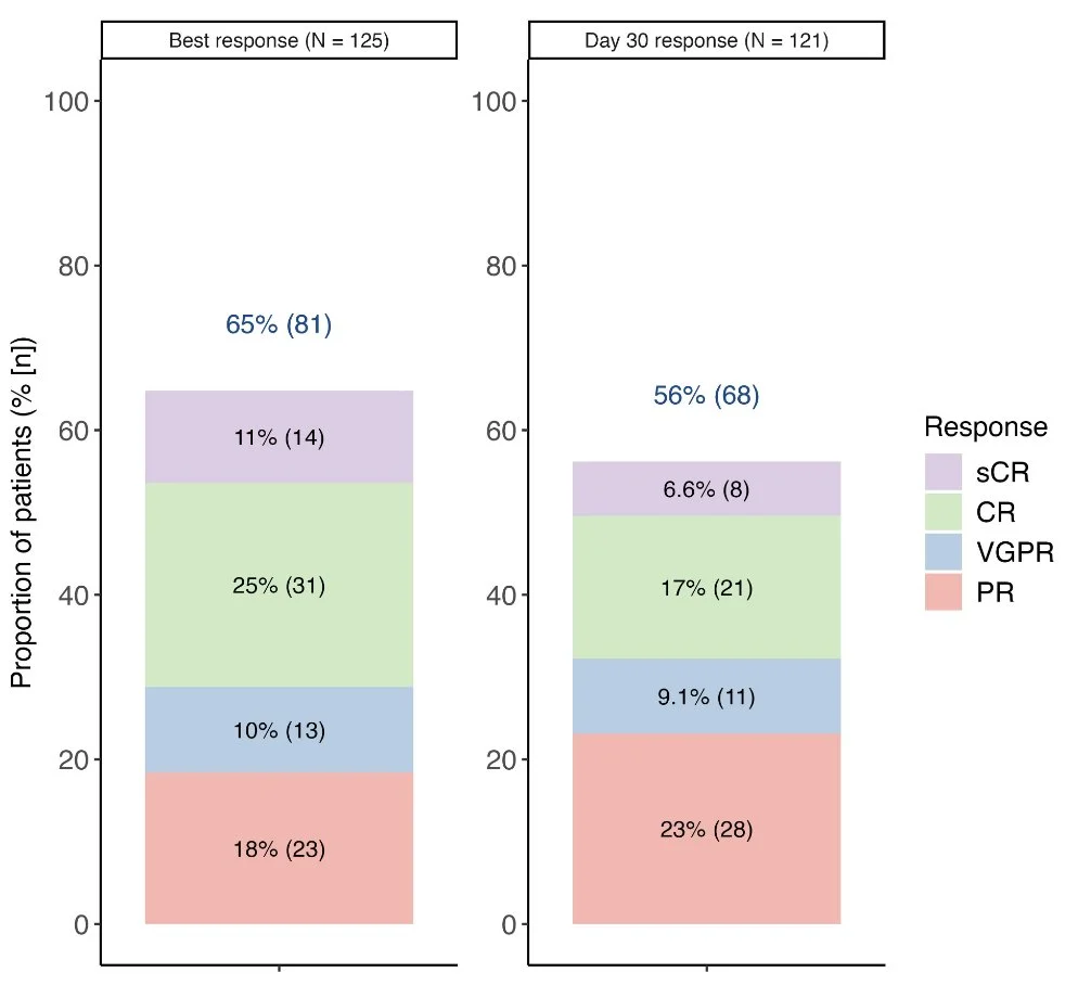 Analysis from US Multiple Myeloma Immunotherapy Consortium of real-world elranatamab data finds median PFS and OS 4.3 and 14.6 mos; elevated LDH and low Hgb predict poor outcomes; prior BCMA exposure reduced response depth.”