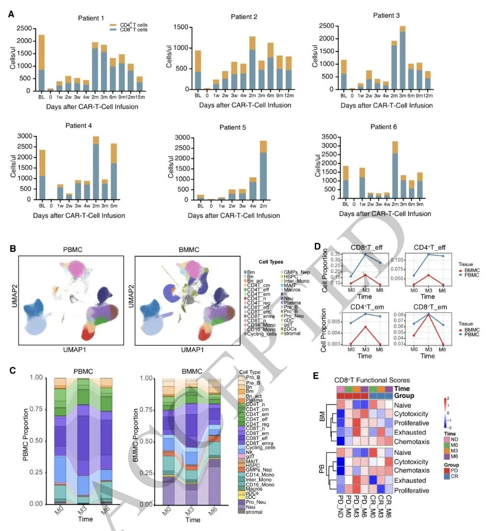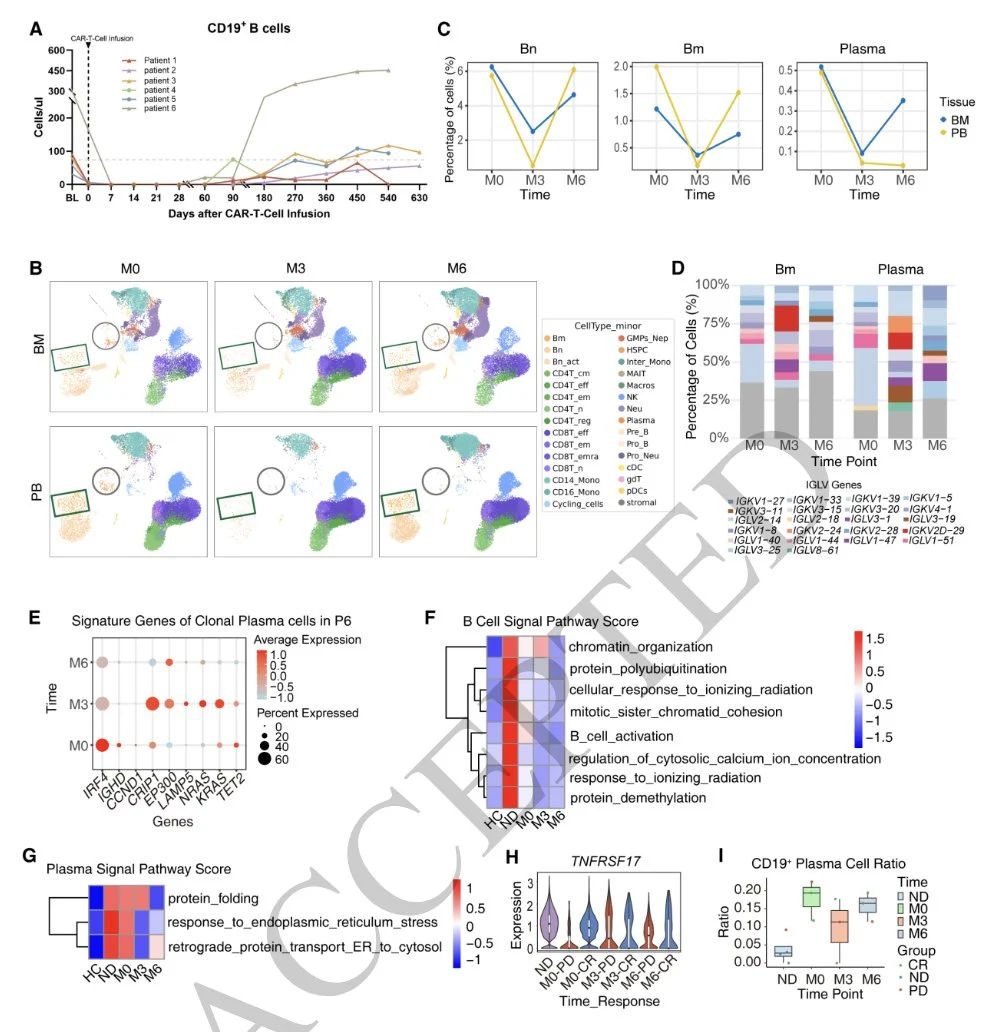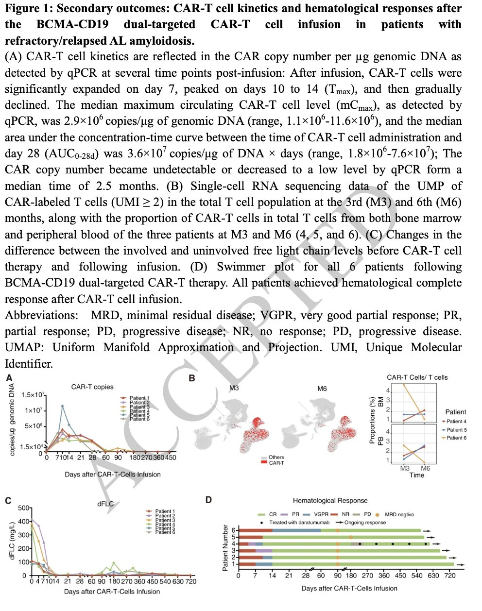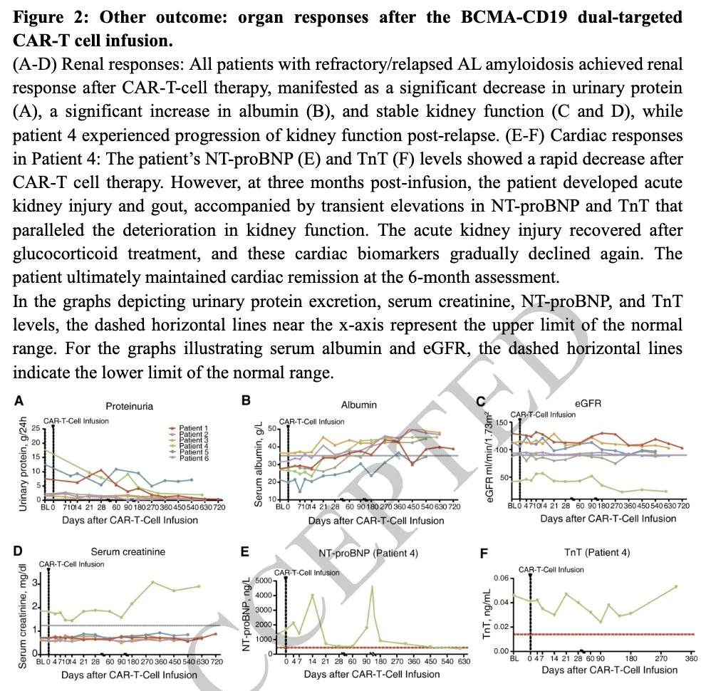 BCMA-CD19 dual CAR-T therapy for relapsed/refractory AL amyloidosis (N=6) shows 100% heme CR and renal response; median time to heme and renal response 9 and 75 days; 1 patient relapsed at month 6; G1 CRS in 2 pts and no ICANS.”