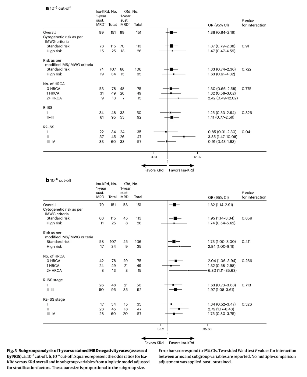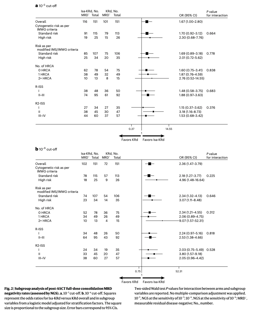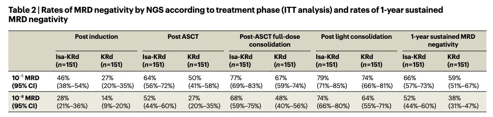 Phase 3 EMN24 IsKia trial shows Isa-KRd significantly improved NGS-MRD negativity 10-6 (68% vs 48% for KRd; OR 2.36, P=0.0004) in NDMM TE pts w/ good safety (G3-4 non-heme AEs, treatment stops, deaths due to AEs similar).”