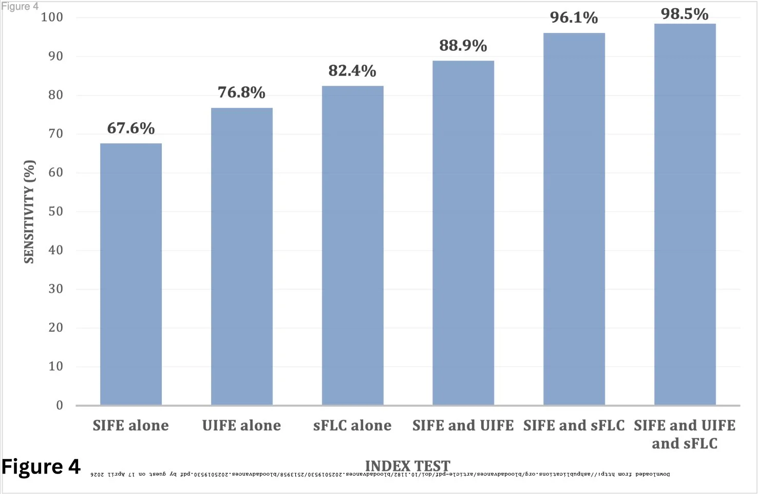 Systematic review and meta-analysis concludes immunofixation (SIFE and UIFE) and sFLC ratio combined give sensitivity of 0.99 (0.96-1.00)) as reliable initial testing strategy to raise suspicion of diagnosis of AL amyloidosis.”