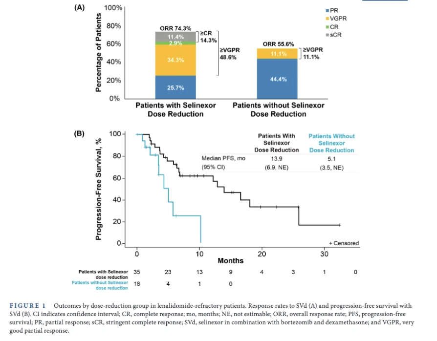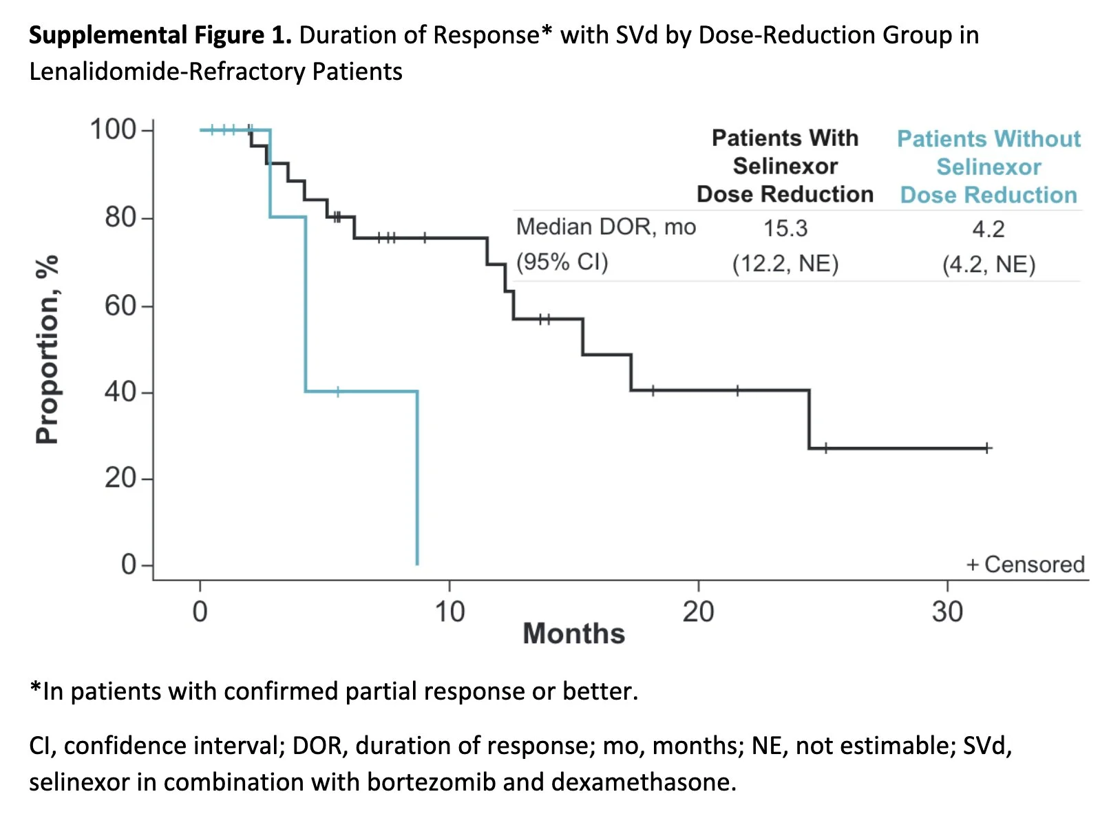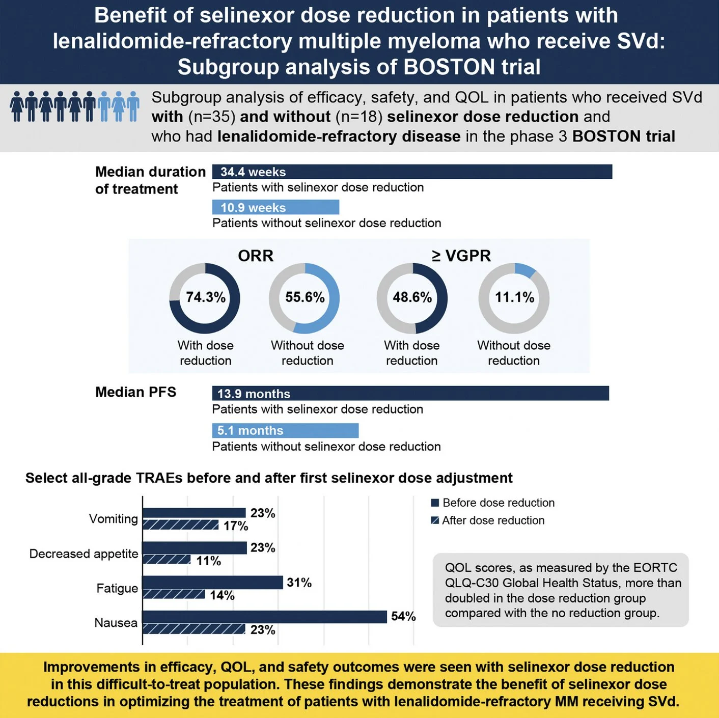 Subgroup analysis of efficacy, safety and QOL in patients who received selinexor/bortez/dexa with and without selinexor dose reduction shows improvements in efficacy, quality of life (QOL) and safety outcomes with dose reduction.”