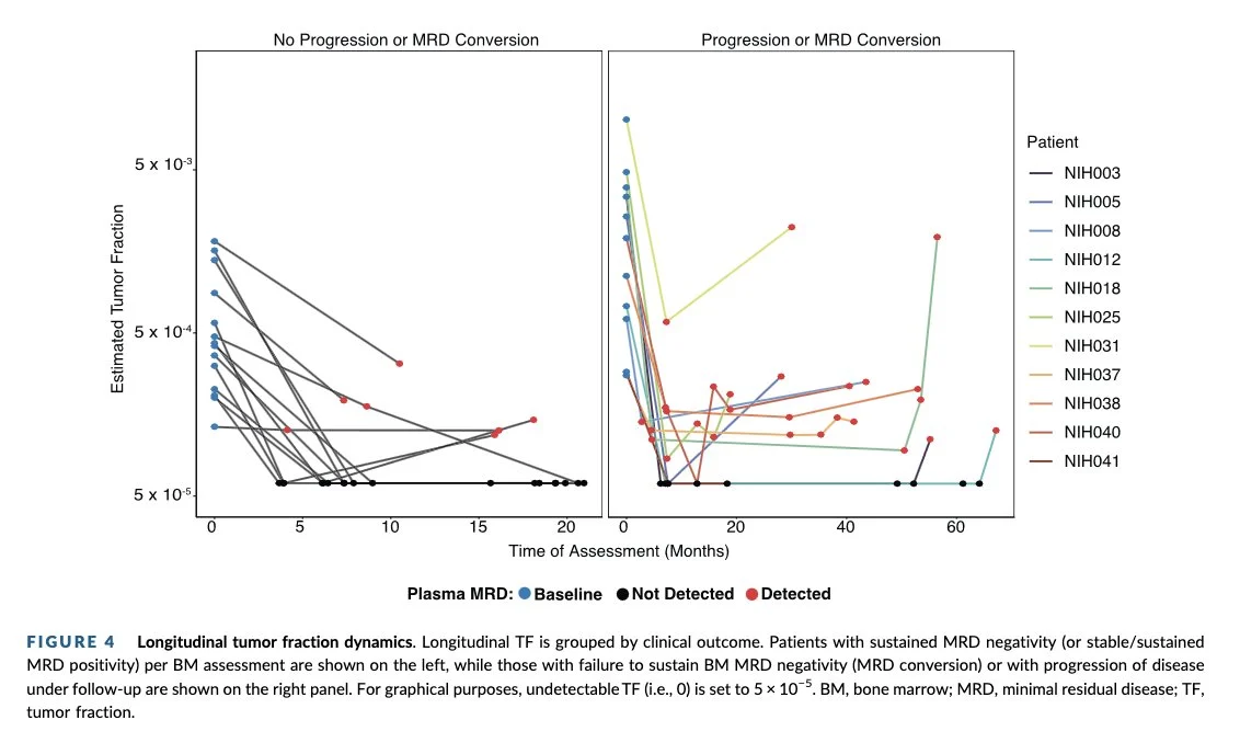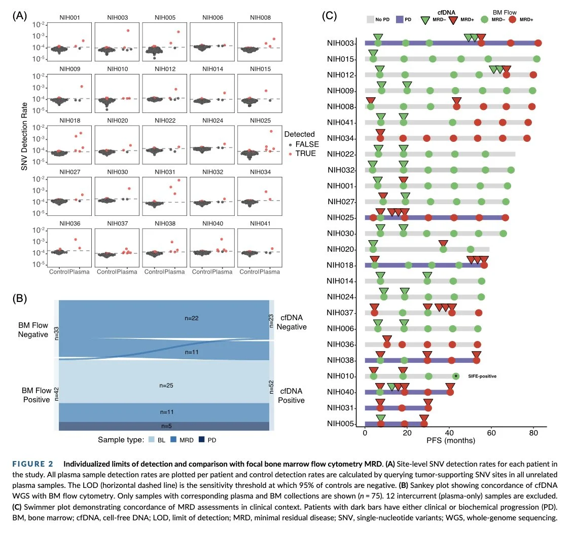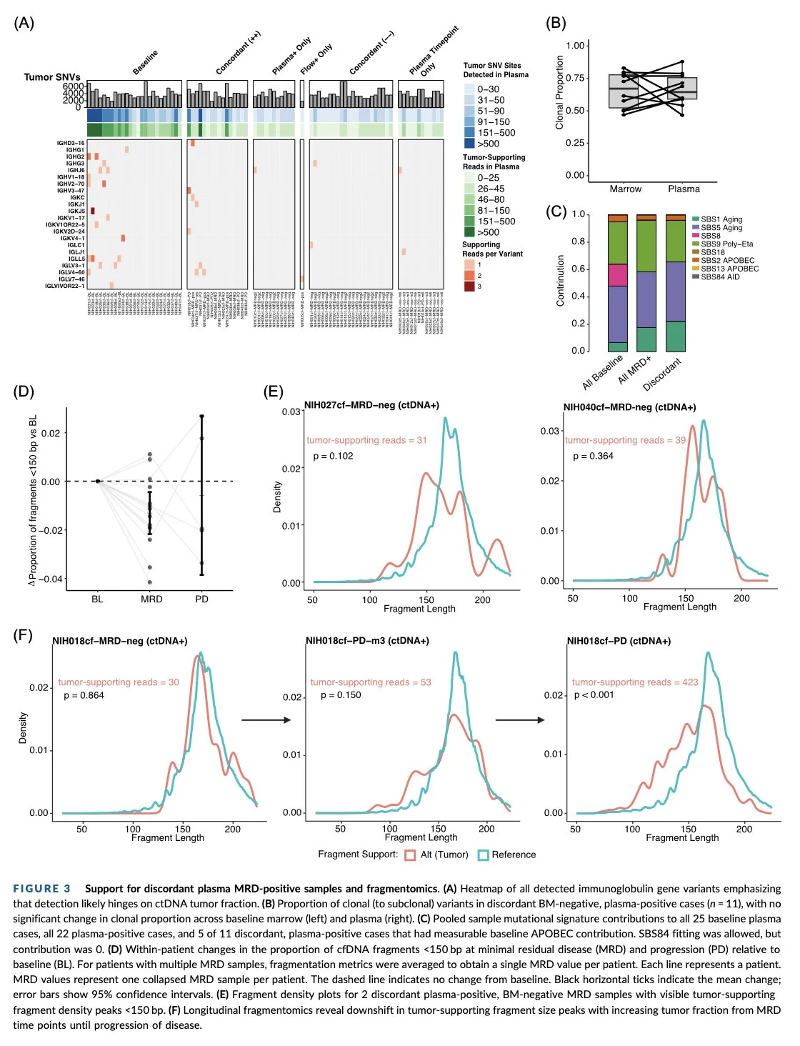 WGS of cell-free DNA for MRD assessment in high-risk smoldering myeloma finds concordance in 33/45 (73.3%) samples with consistent capture of BM-positive cases and added resolution to apparent false-negative BM samples.”