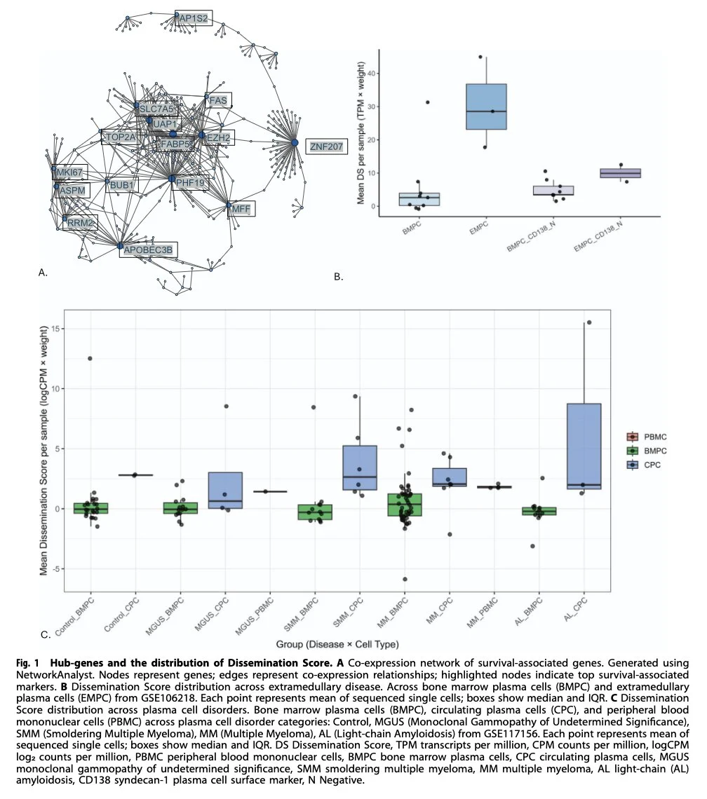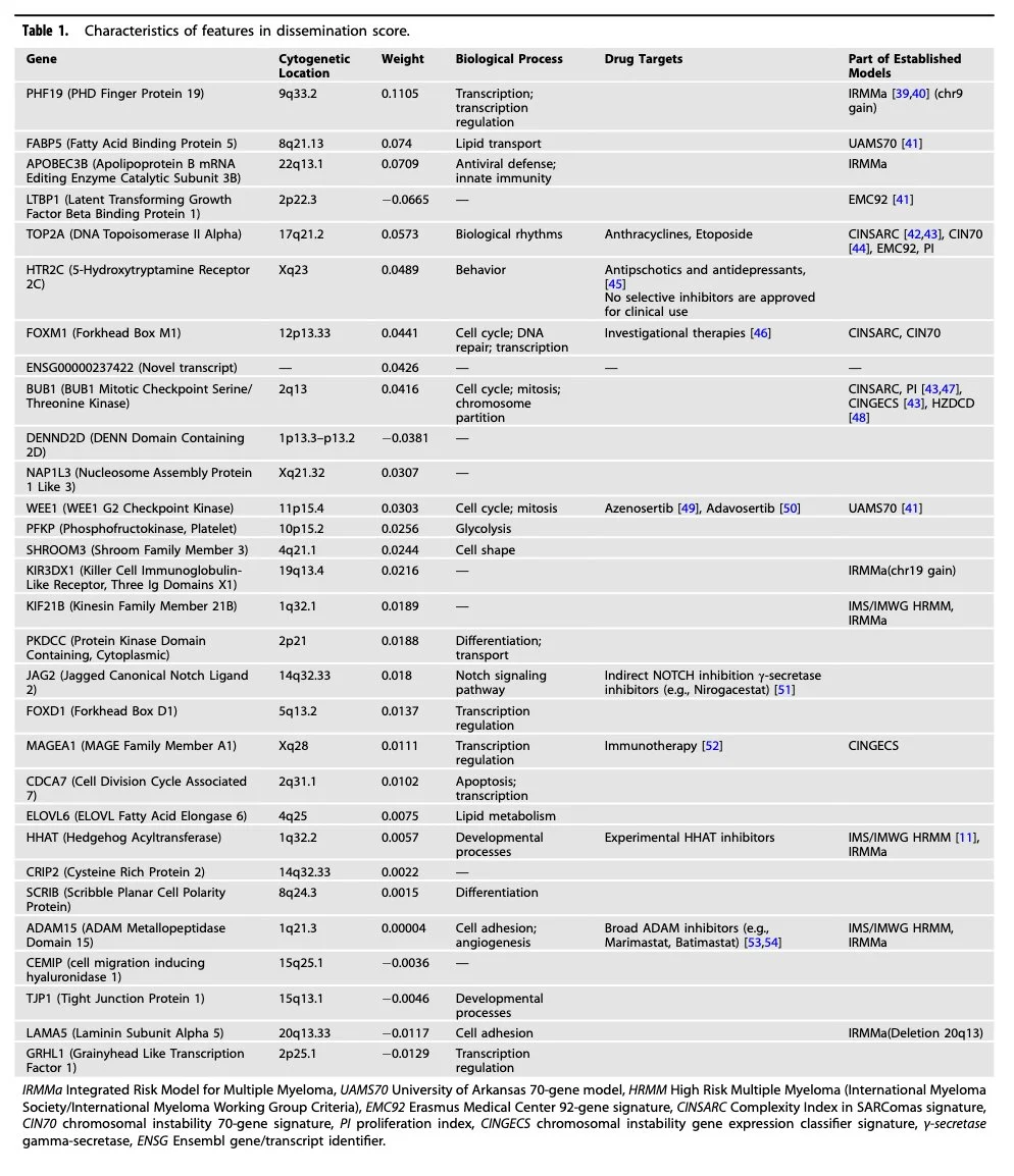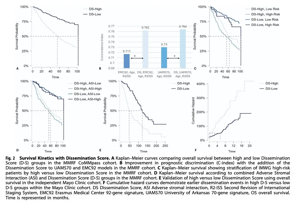 30-gene Dissemination Score (DS) stratifies overall survival (54.5 vs 102.5 mo; C-index 0.71) & has improved prognostic performance when added to UAMS70 and EMC92 to predict early spread and poor outcomes in multiple myeloma.”