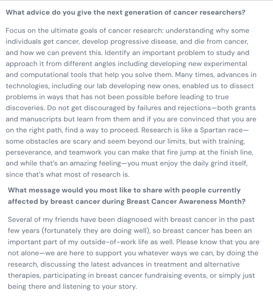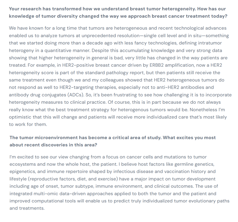 She is recognized for seminal contributions to the Tumor Microenvironment and Tumor Heterogeneity fields that lead to major advances in our understanding of breast tumorigenesis.”
