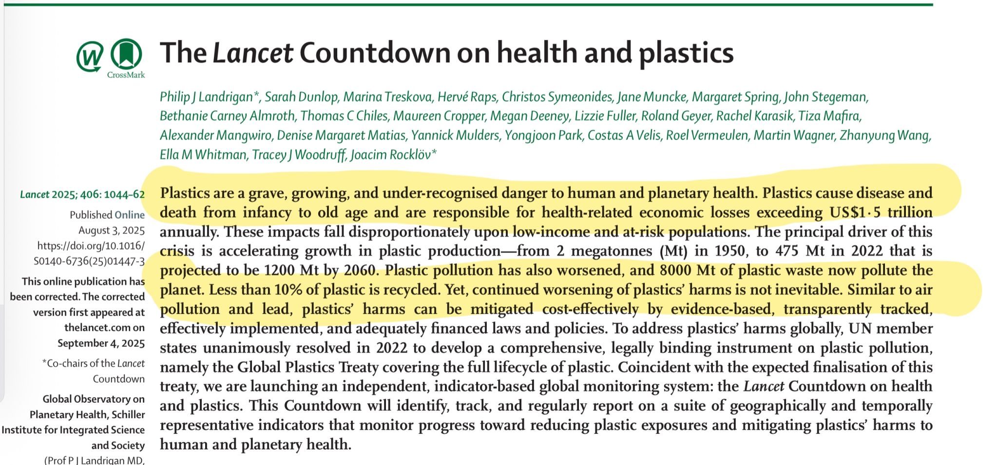Authors: Philip J Landrigan, Sarah Dunlop, Marina Treskova, Hervé Raps, Christos Symeonides, Jane Muncke, Margaret Spring, John Stegeman, Bethanie Carney Almroth, Thomas C Chiles, Maureen Cropper, Megan Deeney, Lizzie Fuller, Roland Geyer, Rachel Karasik, Tiza Mafira, Alexander Mangwiro, Denise Margaret Matias, Yannick Mulders, Yongjoon Park, Costas A Velis, Roel Vermeulen, Martin Wagner, Zhanyung Wang, Ella M Whitman, Tracey J Woodruff, and Joacim Rocklöv